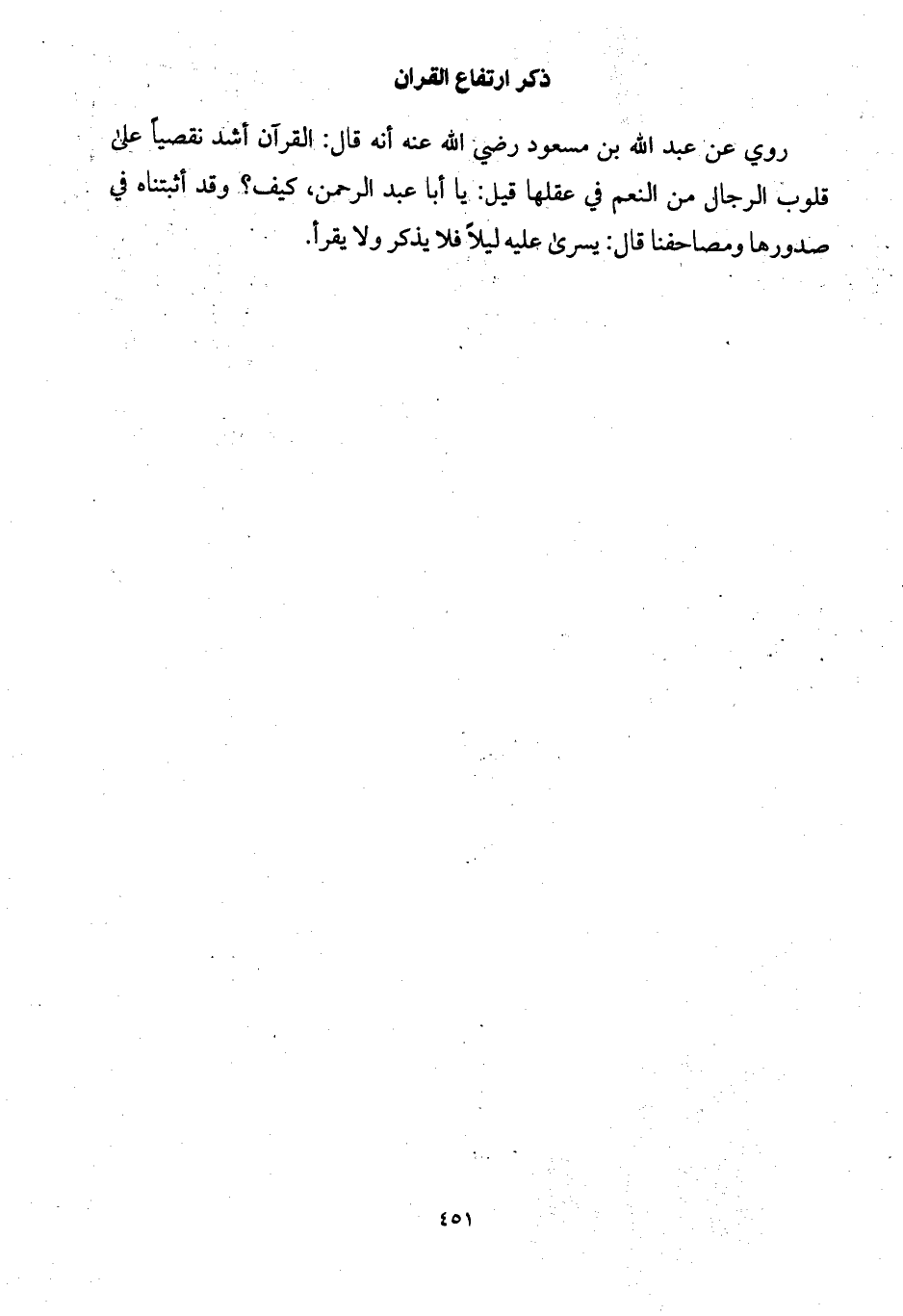 روي عن عبد الله بن مسعود رضي الله عنه أنه قال: القرآن أشد نقصياً على قلوب الرجال من النعم في عقلها قيل: يا أبا عبد الرحمن، كيف؟ وقد أثبتناه في صدورها ومصاحفنا قال: يسرى عليه ليلاً فلا يذكر ولا يقرأ.