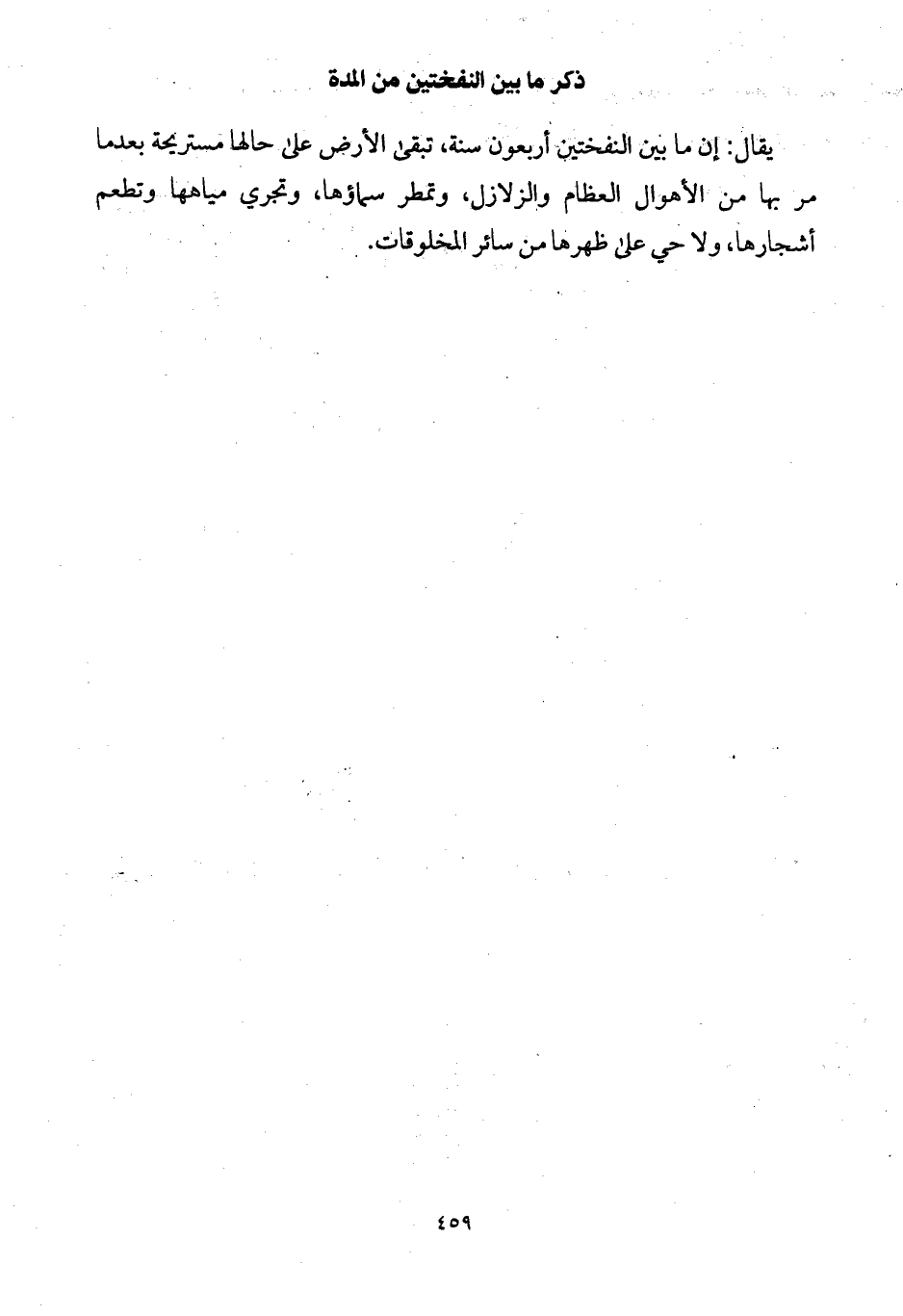 يقال: إن ما بين النفختين أربعون سنة، تبقى الأرض على حالها مستريحة بعدما مر بها من الأهوال العظام والزلازل، وتمطر سماؤها، وتجري مياهها وتطعم أشجارها، ولا حي على ظهرها من سائر المخلوقات.