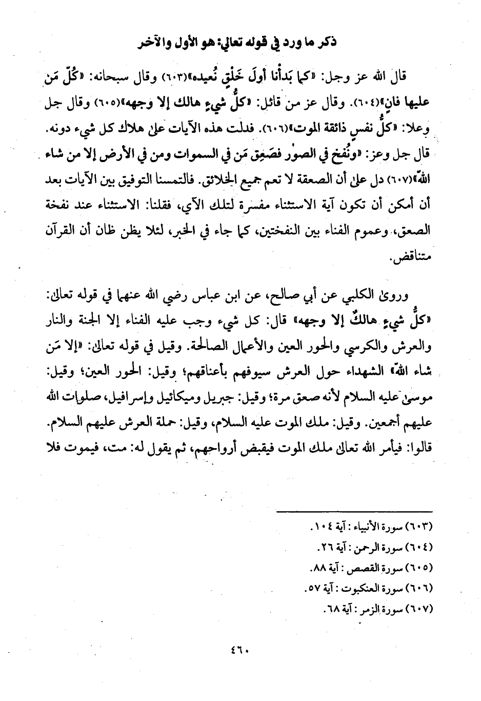 قال الله عز وجل: " كما بَدأْنا أولَ خَلْقٍ نُعيده " وقال سبحانه: " كُلّ مَن عليها فانٍ ". وقال عز من قائل: " كلُّ شيءٍ هالك إلا وجهه " وقال جل وعلا: " كلُّ نفسٍ ذائقة الموت ". فدلت هذه الآيات على هلاك كل شيء دونه. قال جل وعز: " ونُفخ في الصور فصَعِق مَن في السموات ومن في الأرض إلا من شاء الله " دل على أن الصعقة لا تعم جميع الخلائق. فالتمسنا التوفيق بين الآيات بعد أن أمكن أن تكون آية الاستثناء مفسرة لتلك الآي، فقلنا: الاستثناء عند نفخة الصعق، وعموم الفناء بين النفختين، كما جاء في الخبر، لئلا يظن ظان أن القرآن متناقض.