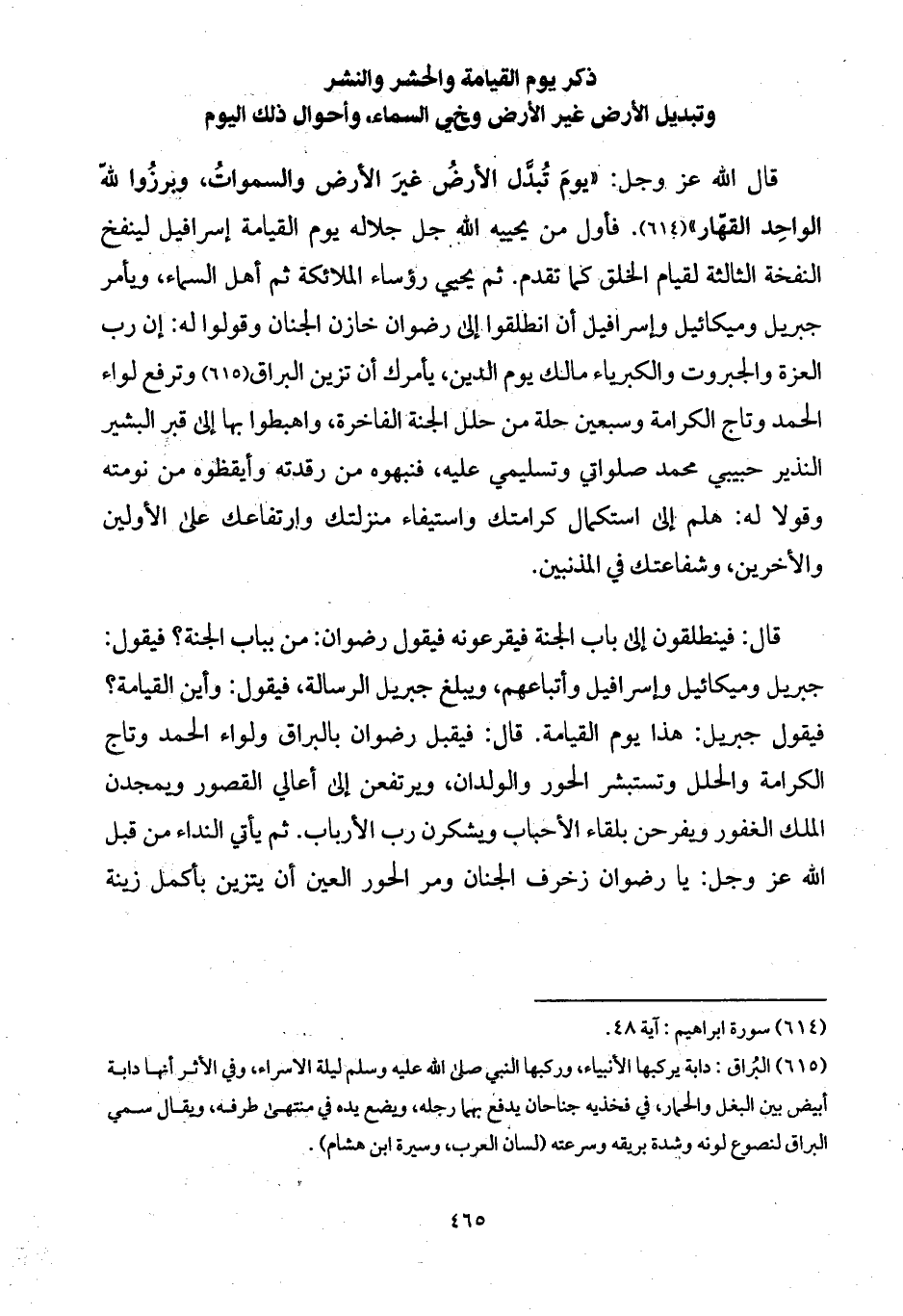 قال الله عز وجل: " يومَ تُبدَّل الأرضُ غيرَ الأرض والسمواتُ، وبرزُوا لله الواحِد القهّار ". فأول من يحييه الله جل جلاله يوم القيامة إسرافيل لينفخ النفخة الثالثة لقيام الخلق كما تقدم. ثم يحيي رؤساء الملائكة ثم أهل السماء، ويأمر جبريل وميكائيل وإسرافيل أن انطلقوا إلى رضوان خازن الجنان وقولوا له: إن رب العزة والجبروت والكبرياء مالك يوم الدين، يأمرك أن تزين البراق وترفع لواء الحمد وتاج الكرامة وسبعين حلة من حلل الجنة الفاخرة، واهبطوا بها إلى قبر البشير النذير حبيبي محمد صلواتي وتسليمي عليه، فنبهوه من رقدته وأيقظوه من نومته وقولا له: هلم إلى استكمال كرامتك واستيفاء منزلتك وارتفاعك على الأولين والأخرين، وشفاعتك في المذنبين.