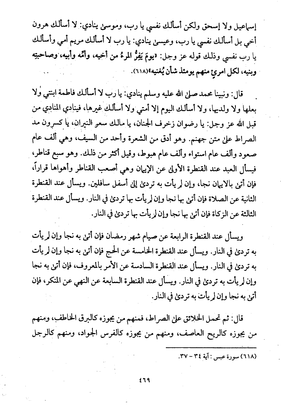قال: ونبينا محمد صلى الله عليه وسلم ينادي: يا رب لا أسألك فاطمة ابنتي ولا بعلها ولا ولديها، ولا أسألك اليوم إلا أمتي ولا أسألك غيرها، فينادي المنادي من قبل الله عز وجل: يا رضوان زخرف الجنان، يا مالك سعر النيران، يا كسرون مد الصراط على متن جهنم. وهو أدق من الشعرة وأحد من السيف، وهي ألف عام صعود وألف عام استواء وألف عام هبوط، وقيل أكثر من ذلك. وهو سبع قناطر، فيسأل العبد عند القنطرة الأولى عن الإيمان وهي أصعب القناطر وأهواها قراراً، فإن أتى بالايمان نجا، وإن لم يأت به تردى إلى أسف سافلين. ويسأل عند القنطرة الثانية عن الصلاة فإن أتى بها نجا وإن لم يأت بها تردى في النار. ويسأل عند القنطرة الثالثة عن الزكاة فإن أتى بها نجا وإن لم يأت بها تردى في النار. ويسأل عند القنطرة الرابعة عن صيام شهر رمضان فإن أتى به نجا وإن لم يأت به تردى في النار. ويسأل عند القنطرة الخامسة عن الحج فإن أتى به نجا وإن لم يأت به تردى في النار. ويسأل عند القنطرة السادسة عن الأمر بالمعروف، فإن أتى به نجا وإن لم يأت به تردى في النار. ويسأل عند القنطرة السابعة عن النهي عن المنكر، فإن أتى به نجا وإن لم يأت به تردى في النار.