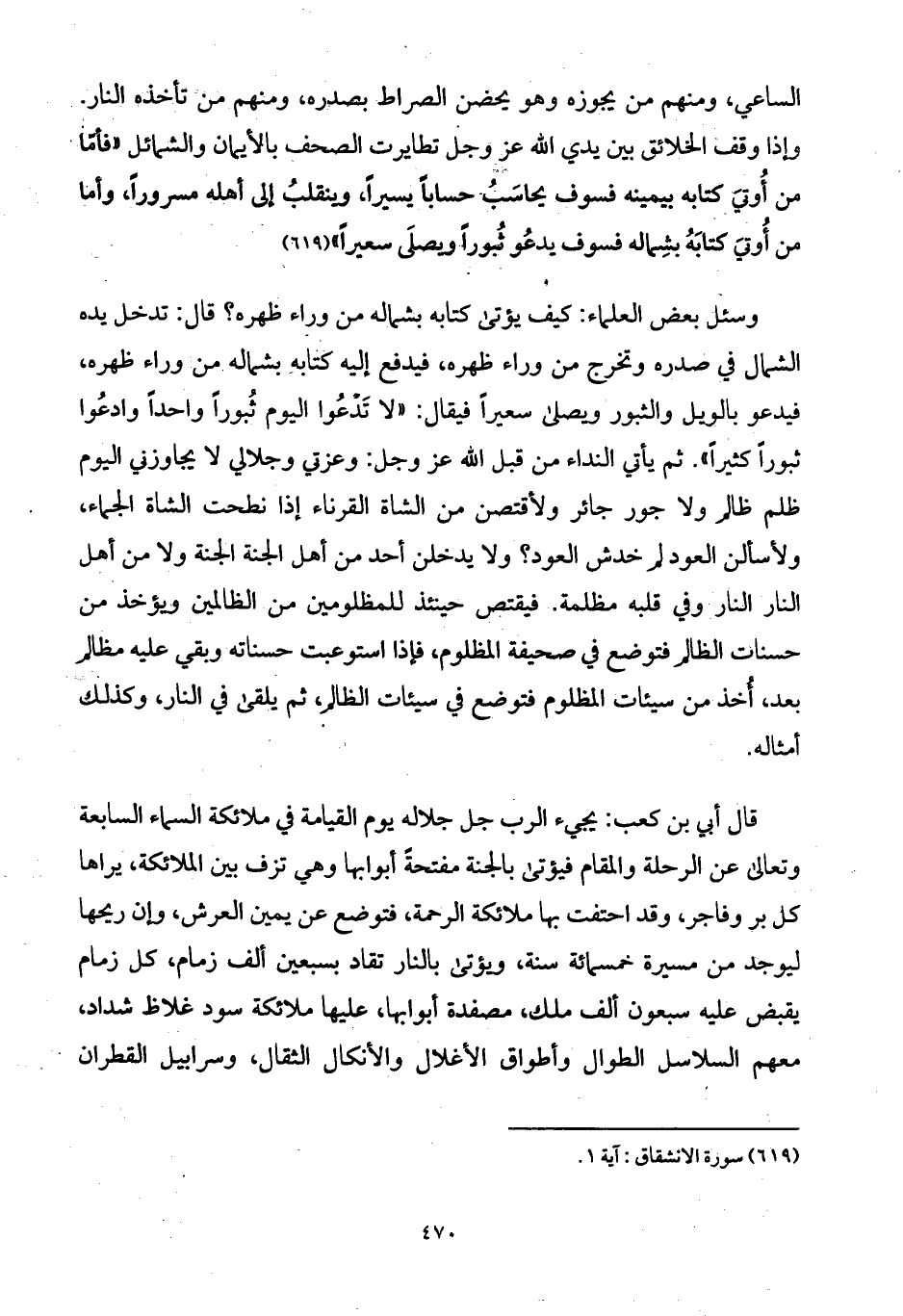 وسئل بعض العلماء: كيف يؤتى كتابه بشماله من وراء ظهره؟ قال: تدخل يده الشمال في صدره وتخرج من وراء ظهره، فيدفع إليه كتابه بشماله من وراء ظهره، فيدعو بالويل والثبور ويصلى سعيراً فيقال: " لا تَدْعُوا اليوم ثُبوراً واحداً وادعُوا ثبوراً كثيراً ". ثم يأتي النداء من قبل الله عز وجل: وعزتي وجلالي لا يجاوزني اليوم ظلم ظالم ولا جور جائر ولأقتصن من الشاة القرناء إذا نطحت الشاة الجماء، ولأسألن العود لم خدش العود؟ ولا يدخلن أحد من أهل الجنة الجنة ولا من أهل النار النار وفي قلبه مظلمة. فيقتص حينئذ للمظلومين من الظالمين ويؤخذ من حسنات الظالم فتوضع في صحيفة المظلوم، فإذا استوعبت حسناته وبقي عليه مظالم بعد، أُخذ من سيئات المظلوم فتوضع في سيئات الظالم، ثم يلقى في النار، وكذلك أمثاله.