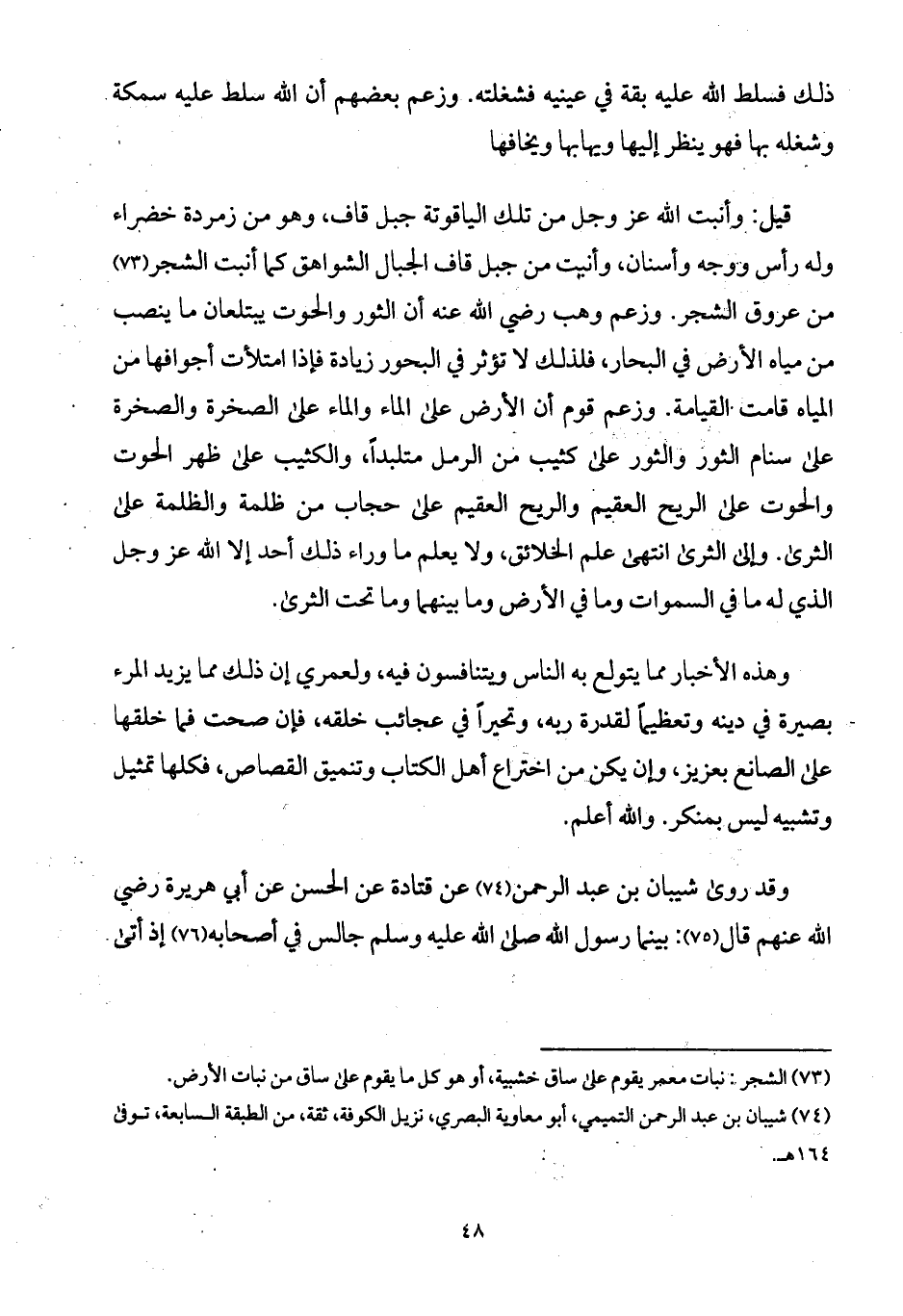 وهذه الأخبار مما يتولع به الناس ويتنافسون فيه، ولعمري إن ذلك مما يزيد المرء بصيرة في دينه وتعظيماً لقدرة ربه، وتحيراً في عجائب خلقه، فإن صحت فما خلقها على الصانع بعزيز، وإن يكن من اختراع أهل الكتاب وتنميق القصاص، فكلها تمثيل وتشبيه ليس بمنكر. والله أعلم.