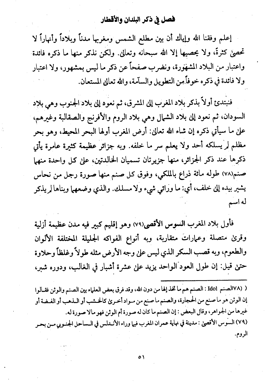 فنبتدئ أولاً بذكر بلاد المغرب إلى المشرق، ثم نعود إلى بلاد الجنوب وهي بلاد السودان، ثم نعود إلى بلاد الشمال وهي بلاد الروم والأفرنج والصقالبة وغيرهم، على ما سيأتي ذكره إن شاء الله تعالى: أرض المغرب أولها البحر المحيط، وهو بحر مظلم لم يسلكه أحد ولا يعلم سر ما خلفه. وبه جزائر عظيمة كثيرة عامرة يأتي ذكرها عند ذكر الجزائر، منها جزيرتان تسميان الخالدتين، على كل واحدة منهما صنم طوله مائة ذراع بالملكي، وفوق كل صنم منها صورة رجل من نحاس يشير بيده إلى خلف، أي: ما ورائي شيء ولا مسلك. والذي وضعهما وبناها لم يذكر له اسم.