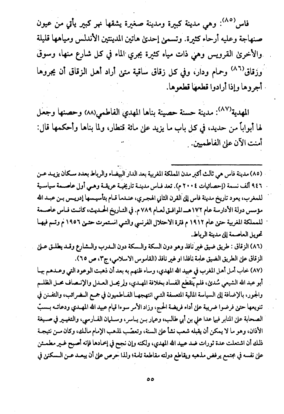 فاس: وهي مدينة كبيرة ومدينة صغيرة يشقها نهر كبير يأتي من عيون صنهاجة وعليه أرحاء كثيرة. وتسمى إحدى هاتين المدينتين الأندلس ومياهها قليلة والأخرى القرويس وهي ذات مياه كثيرة يجري الماء في كل شارع منها، وسوق وزقاق وحمام ودار، وفي كل زقاق ساقية متى أراد أهل الزقاق أن يجروها أجروها وإذا أرادوا قطعها قطعوها.