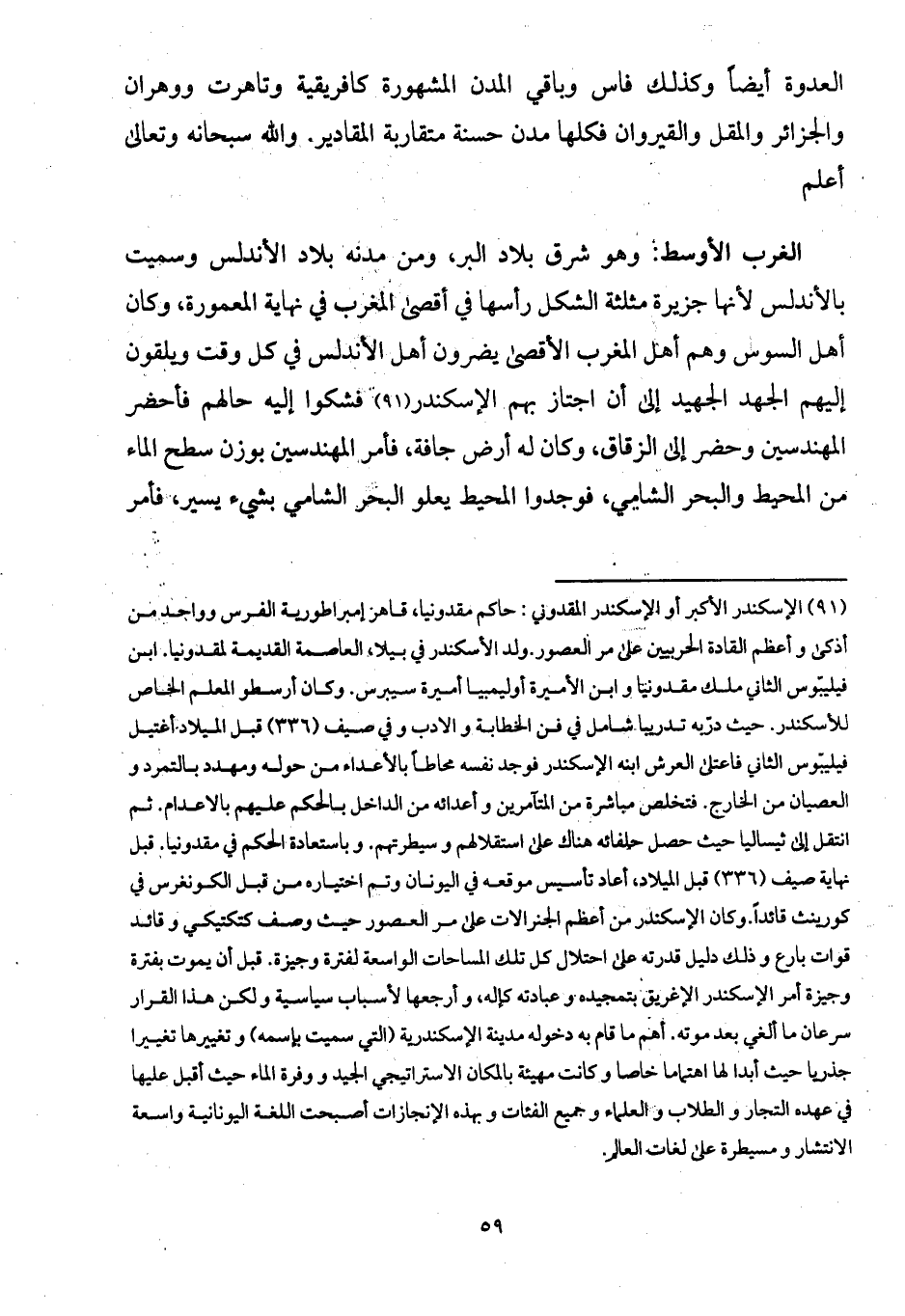 الغرب الأوسط: وهو شرق بلاد البر، ومن مدنه بلاد الأندلس وسميت بالأندلس لأنها جزيرة مثلثة الشكل رأسها في أقصى المغرب في نهاية المعمورة، وكان أهل السوس وهم أهل المغرب الأقصى يضرون أهل الأندلس في كل وقت ويلقون إليهم الجهد الجهيد إلى أن اجتاز بهم الإسكندر فشكوا إليه حالهم فأحضر المهندسين وحضر إلى الزقاق، وكان له أرض جافة، فأمر المهندسين بوزن سطح الماء من المحيط والبحر الشامي، فوجدوا المحيط يعلو البحر الشامي بشيء يسير، فأمر