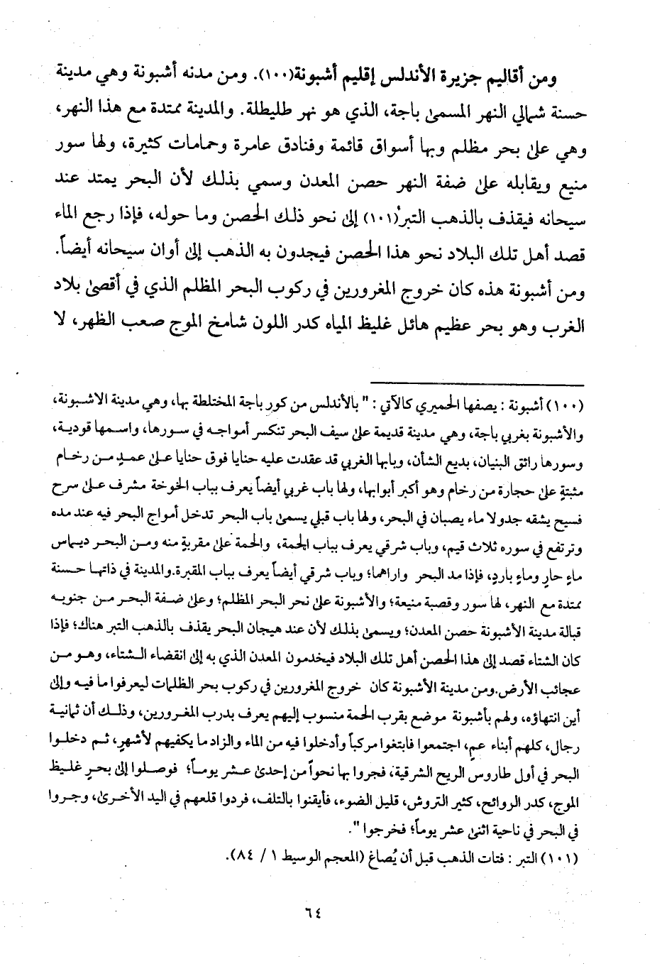 ومن أقاليم جزيرة الأندلس إقليم أشبونة. ومن مدنه أشبونة وهي مدينة حسنة شمالي النهر المسمى باجة، الذي هو نهر طليطلة. والمدينة ممتدة مع هذا النهر، وهي على بحر مظلم وبها أسواق قائمة وفنادق عامرة وحمامات كثيرة، ولها سور منيع ويقابله على ضفة النهر حصن المعدن وسمي بذلك لأن البحر يمتد عند سيحانه فيقذف بالذهب التبر إلى نحو ذلك الحصن وما حوله، فإذا رجع الماء قصد أهل تلك البلاد نحو هذا الحصن فيجدون به الذهب إلى أوان سيحانه أيضاً. ومن أشبونة هذه كان خروج المغرورين في ركوب البحر المظلم الذي في أقصى بلاد الغرب وهو بحر عظيم هائل غليظ المياه كدر اللون شامخ الموج صعب الظهر، لا