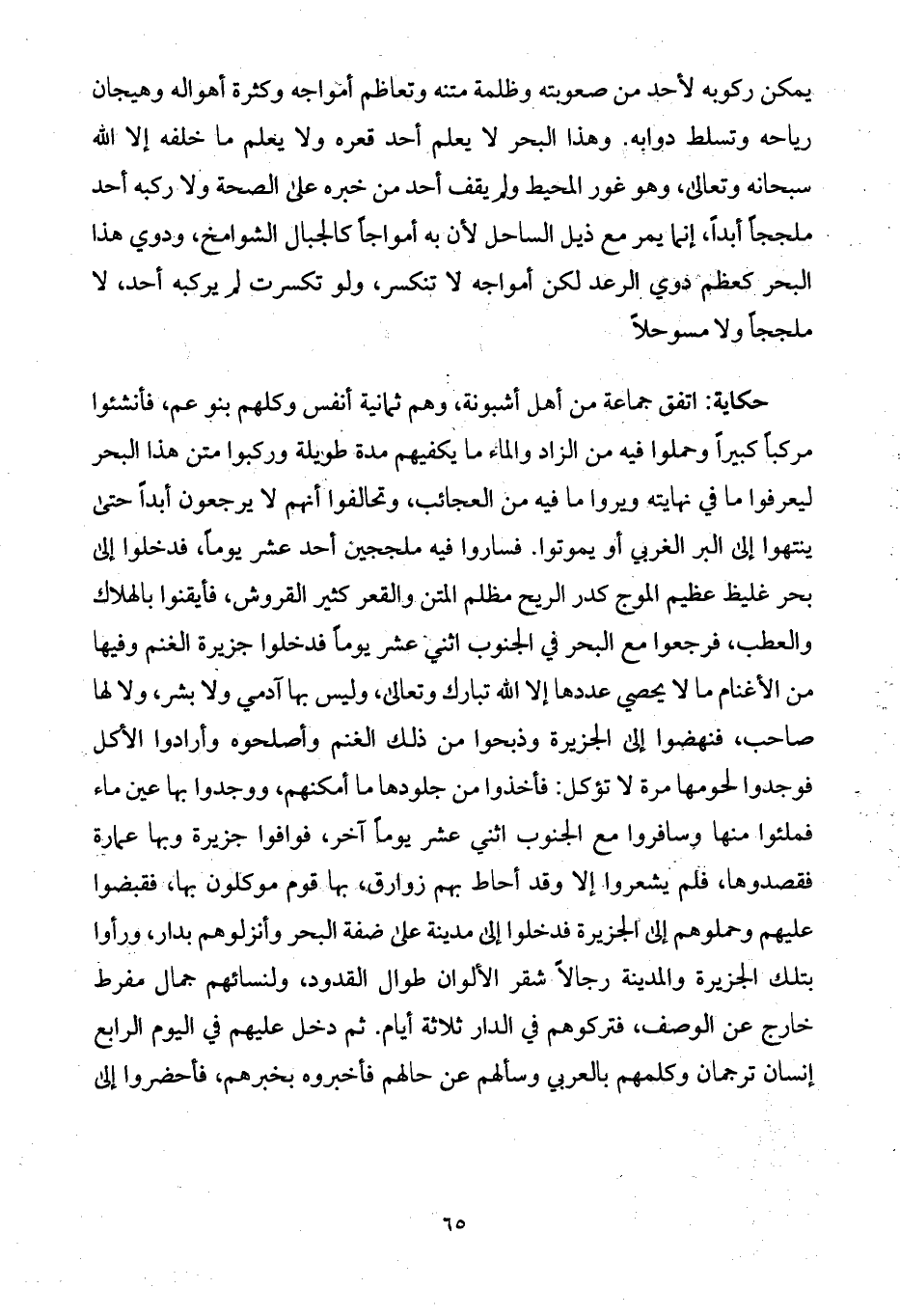 حكاية: اتفق جماعة من أهل أشبونة، وهم ثمانية أنفس وكلهم بنو عم، فأنشئوا مركباً كبيراً وحملوا فيه من الزاد والماء ما يكفيهم مدة طويلة وركبوا متن هذا البحر ليعرفوا ما في نهايته ويروا ما فيه من العجائب، وتحالفوا أنهم لا يرجعون أبداً حتى ينتهوا إلى البر الغربي أو يموتوا. فساروا فيه ملججين أحد عشر يوماً، فدخلوا إلى بحر غليظ عظيم الموج كدر الريح مظلم المتن والقعر كثير القروش، فأيقنوا بالهلاك والعطب، فرجعوا مع البحر في الجنوب اثني عشر يوماً فدخلوا جزيرة الغنم وفيها من الأغنام ما لا يحصي عددها إلا الله تبارك وتعالى، وليس بها آدمي ولا بشر، ولا لها صاحب، فنهضوا إلى الجزيرة وذبحوا من ذلك الغنم وأصلحوه وأرادوا الأكل فوجدوا لحومها مرة لا تؤكل: فأخذوا من جلودها ما أمكنهم، ووجدوا بها عين ماء فملئوا منها وسافروا مع الجنوب اثني عشر يوماً آخر، فوافوا جزيرة وبها عمارة فقصدوها، فلم يشعروا إلا وقد أحاط بهم زوارق، بها قوم موكلون بها، فقبضوا عليهم وحملوهم إلى الجزيرة فدخلوا إلى مدينة على ضفة البحر وأنزلوهم بدار، ورأوا بتلك الجزيرة والمدينة رجالاً شقر الألوان طوال القدود، ولنسائهم جمال مفرط خارج عن الوصف، فتركوهم في الدار ثلاثة أيام. ثم دخل عليهم في اليوم الرابع إنسان ترجمان وكلمهم بالعربي وسألهم عن حالهم فأخبروه بخبرهم، فأحضروا إلى