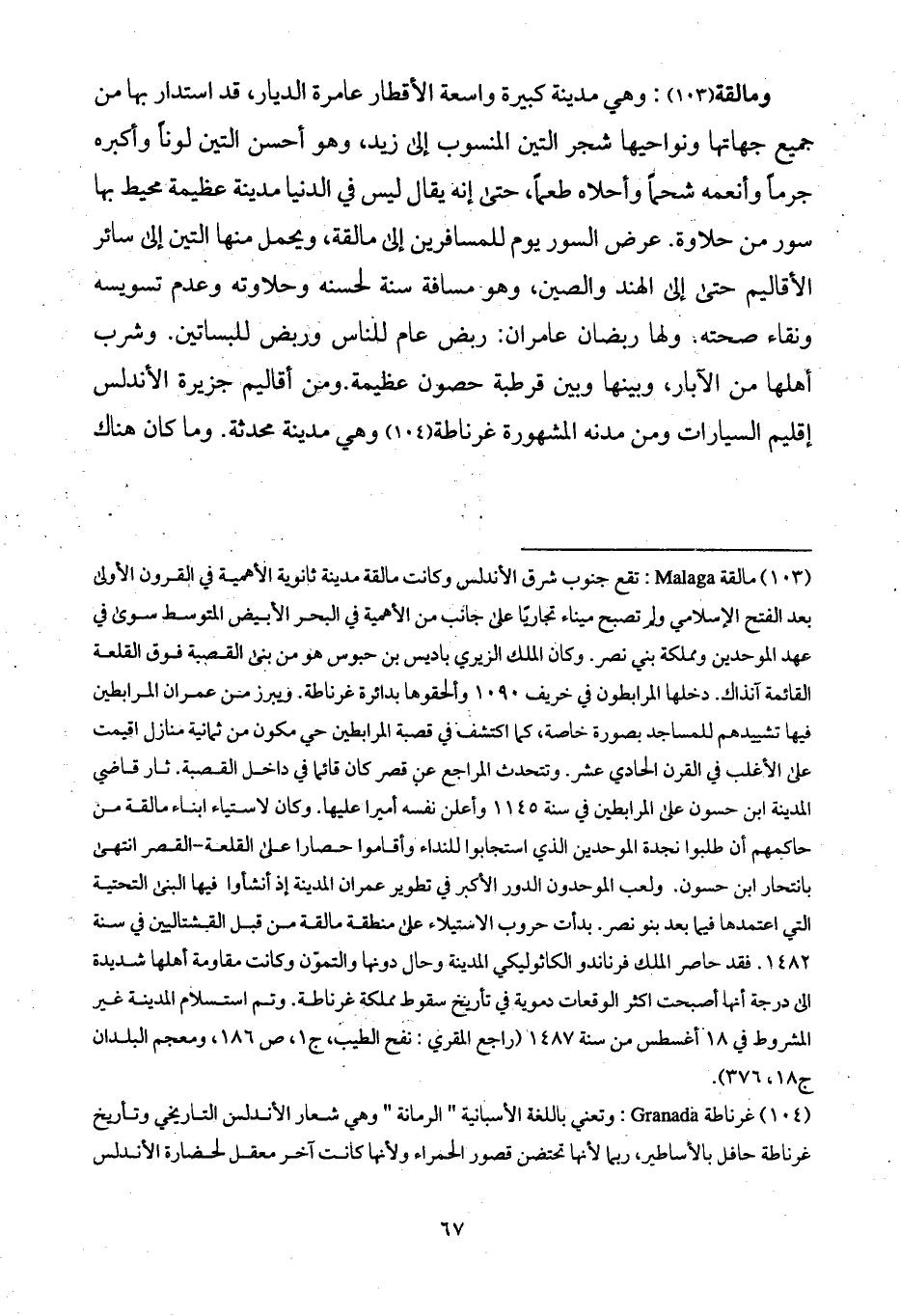 ومالقة: وهي مدينة كبيرة واسعة الأقطار عامرة الديار، قد استدار بها من جميع جهاتها ونواحيها شجر التين المنسوب إلى زيد، وهو أحسن التين لوناً وأكبره جرماً وأنعمه شحماً وأحلاه طعماً، حتى إنه يقال ليس في الدنيا مدينة عظيمة محيط بها سور من حلاوة. عرض السور يوم للمسافرين إلى مالقة، ويحمل منها التين إلى سائر الأقاليم حتى إلى الهند والصين، وهو مسافة سنة لحسنه وحلاوته وعدم تسويسه ونقاء صحته. ولها ربضان عامران: ربض عام للناس وربض للبساتين. وشرب أهلها من الآبار، وبينها وبين قرطبة حصون عظيمة.
