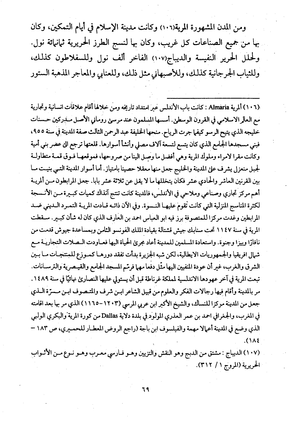 ومن المدن المشهورة المرية وكانت مدينة الإسلام في أيام التمكين، وكان بها من جميع الصناعات كل غريب، وكان بها لنسج الطرز الحريرية ثمانمائة نول. ولحلل الحرير النفيسة والديباج الفاخر ألف نول وللسفلاطون كذلك، وللثياب الجرجانية كذلك، وللأصبهاني مثل ذلك، وللعنابي والمعاجر المذهبة الستور