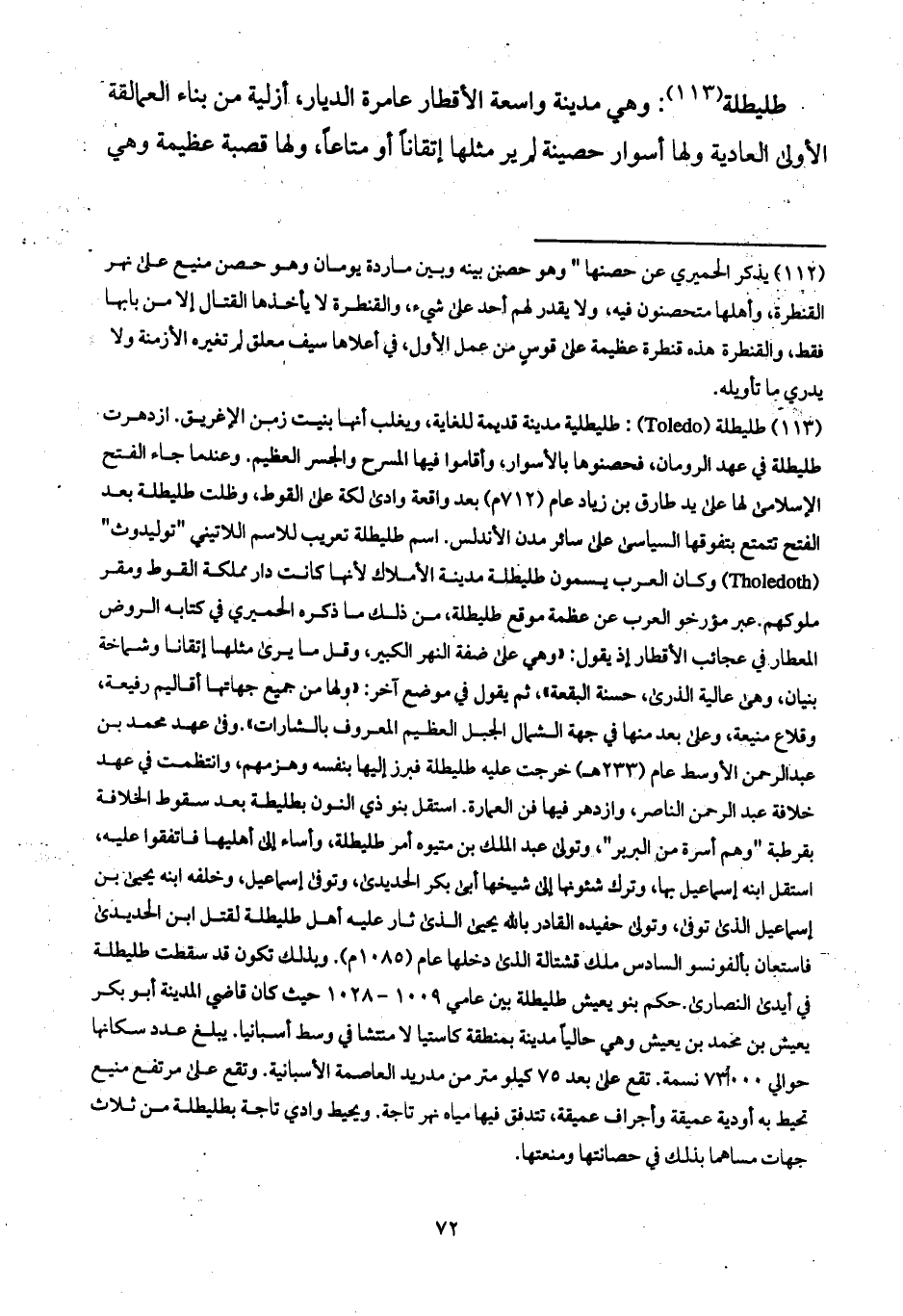 طليطلة: وهي مدينة واسعة الأقطار عامرة الديار، أزلية من بناء العمالقة الأولى العادية ولها أسوار حصينة لم ير مثلها إتقاناً أو متاعاً، ولها قصبة عظيمة وهي