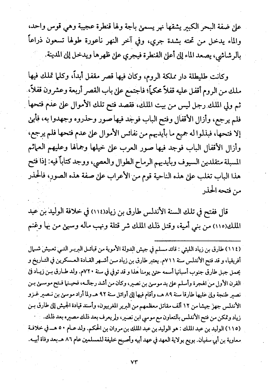 قال ففتح في تلك السنة الأندلس طارق بن زياد في خلافة الوليد بن عبد الملك من بني أمية، وقتل ذلك الملك شر قتلة ونهب ماله وسبى من بها وغنم