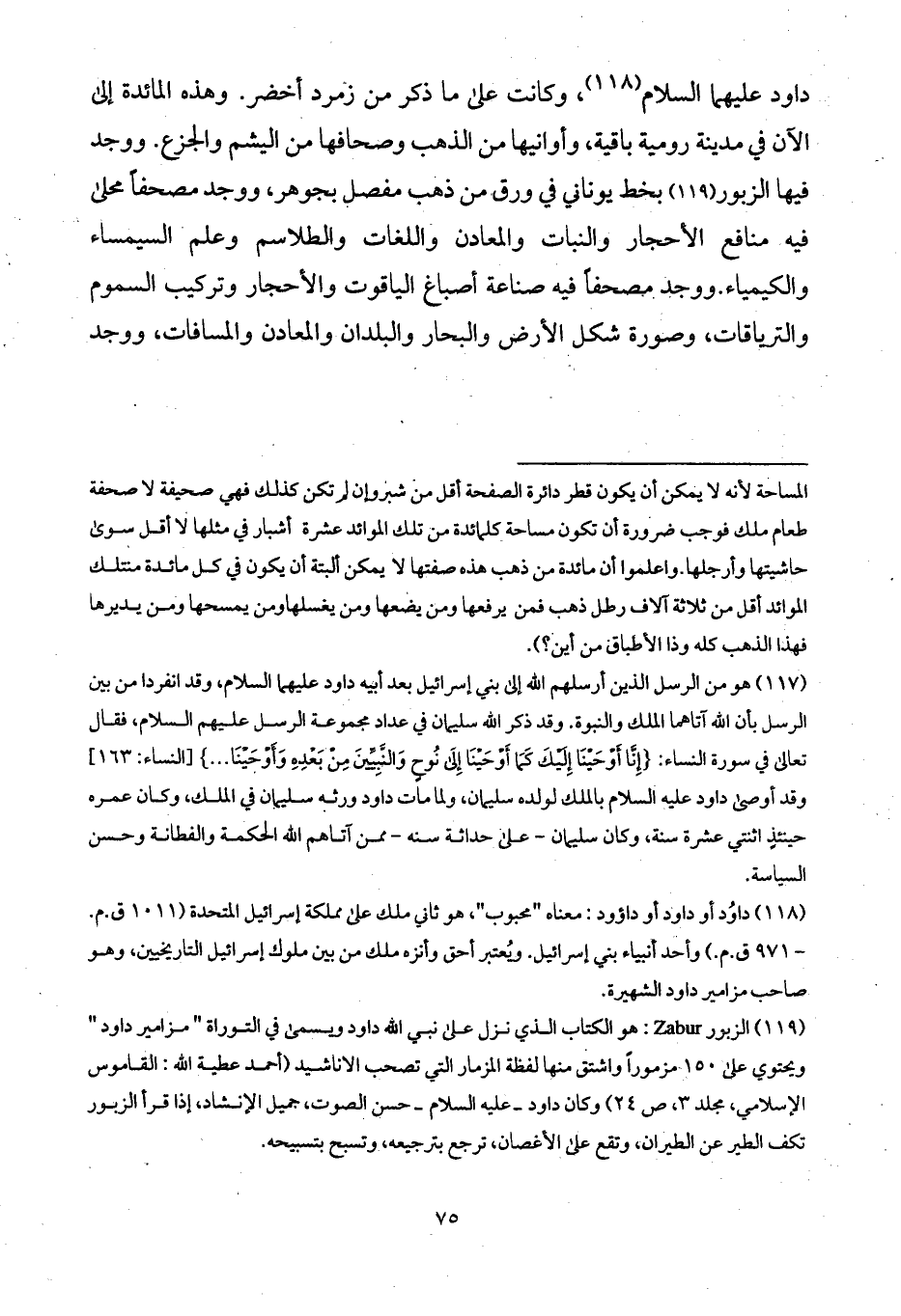 داود عليهما السلام، وكانت على ما ذكر من زمرد أخضر. وهذه المائدة إلى الآن في مدينة رومية باقية، وأوانيها من الذهب وصحافها من اليشم والجزع. ووجد فيها الزبور بخط يوناني في ورق من ذهب مفصل بجوهر، ووجد مصحفاً محلى فيه منافع الأحجار والنبات والمعادن واللغات والطلاسم وعلم السيمساء والكيمياء.
