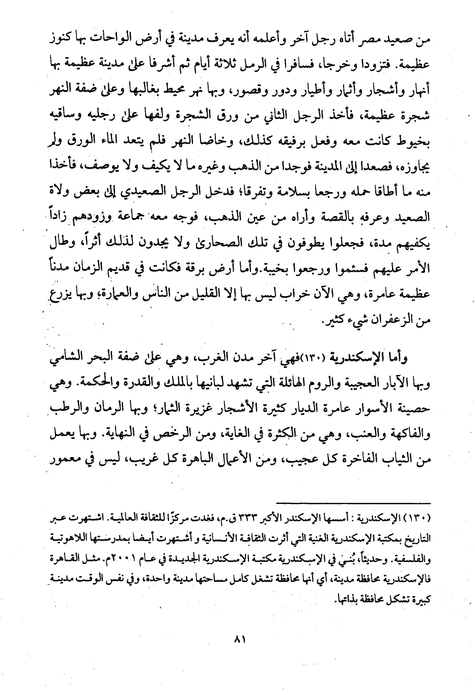وأما الإسكندرية فهي آخر مدن الغرب، وهي على ضفة البحر الشامي وبها الآبار العجيبة والروم الهائلة التي تشهد لبانيها بالملك والقدرة والحكمة. وهي حصينة الأسوار عامرة الديار كثيرة الأشجار غزيرة الثمار؛ وبها الرمان والرطب والفاكهة والعنب، وهي من الكثرة في الغاية، ومن الرخص في النهاية. وبها يعمل من الثياب الفاخرة كل عجيب، ومن الأعمال الباهرة كل غريب، ليس في معمور