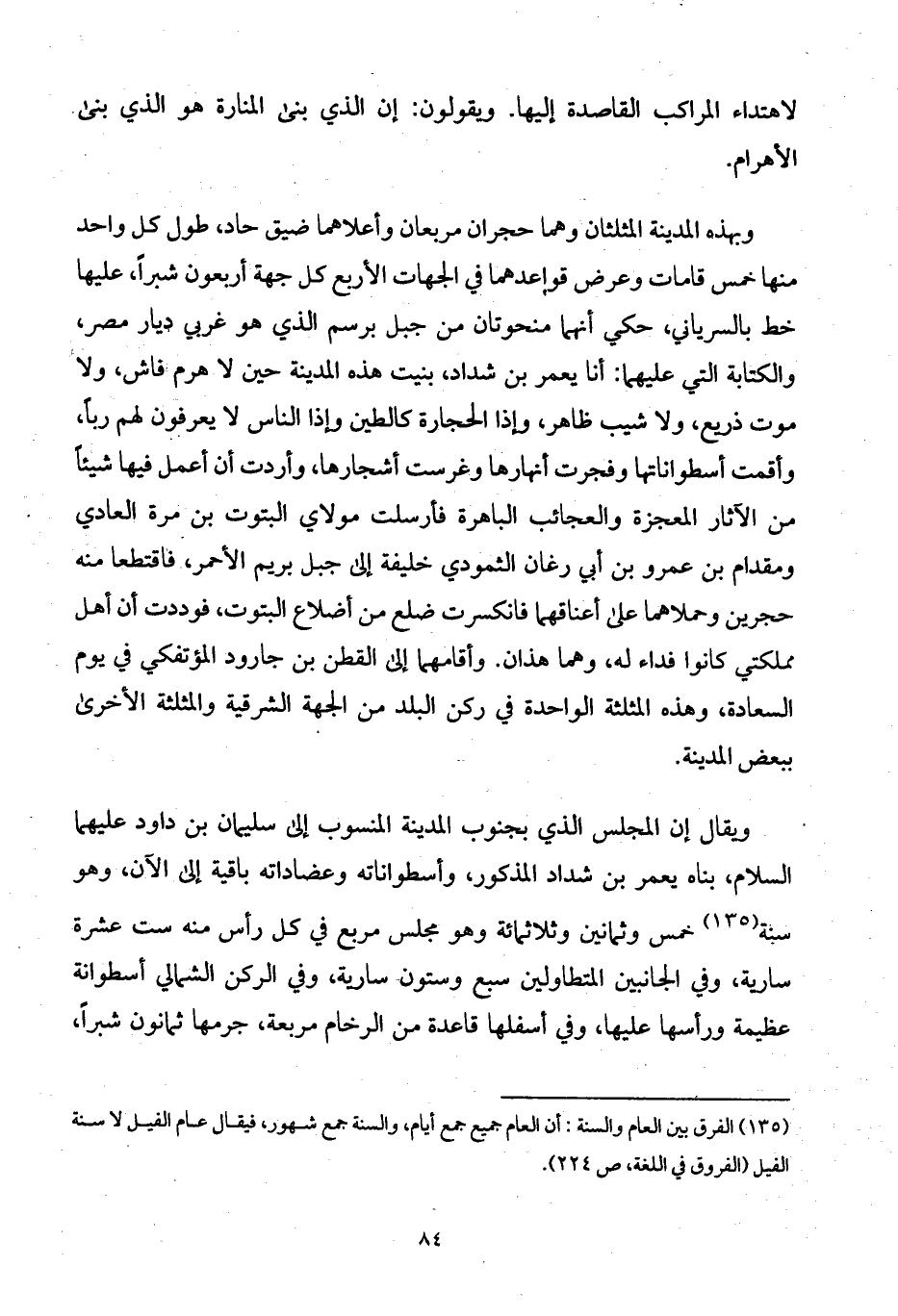 وبهذه المدينة المثلثان وهما حجران مربعان وأعلاهما ضيق حاد، طول كل واحد منها خمس قامات وعرض قواعدهما في الجهات الأربع كل جهة أربعون شبراً، عليها خط بالسرياني، حكي أنهما منحوتان من جبل برسم الذي هو غربي ديار مصر، والكتابة التي عليهما: أنا يعمر بن شداد، بنيت هذه المدينة حين لا هرم فاش، ولا موت ذريع، ولا شيب ظاهر، وإذا الحجارة كالطين وإذا الناس لا يعرفون لهم رباً، وأقمت أسطواناتها وفجرت أنهارها وغرست أشجارها، وأردت أن أعمل فيها شيئاً من الآثار المعجزة والعجائب الباهرة فأرسلت مولاي البتوت بن مرة العادي ومقدام بن عمرو بن أبي رغان الثمودي خليفة إلى جبل بريم الأحمر، فاقتطعا منه حجرين وحملاهما على أعناقهما فانكسرت ضلع من أضلاع البتوت، فوددت أن أهل مملكتي كانوا فداء له، وهما هذان. وأقامهما إلى القطن بن جارود المؤتفكي في يوم السعادة، وهذه المثلثة الواحدة في ركن البلد من الجهة الشرقية والمثلثة الأخرى ببعض المدينة.