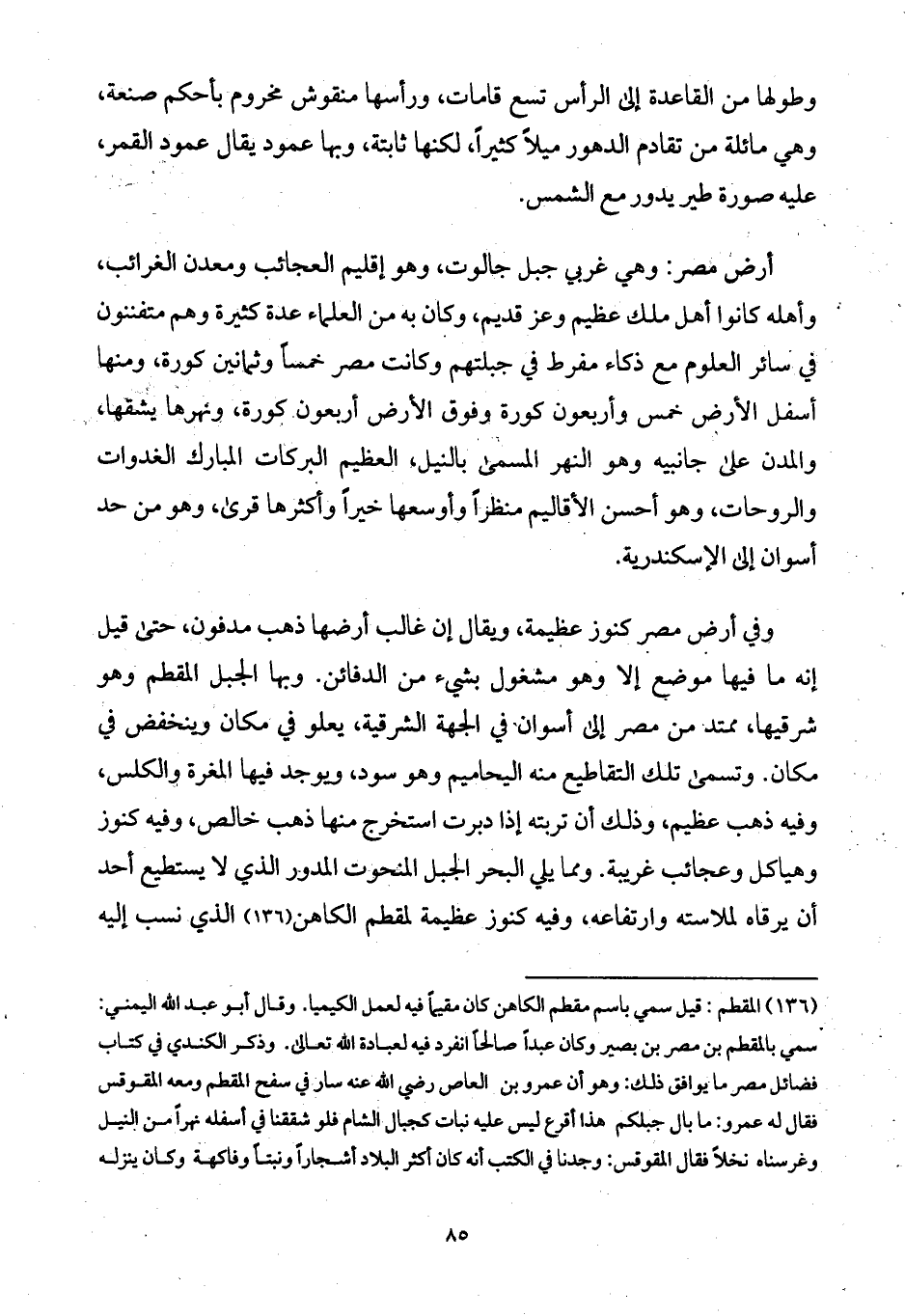 أرض مصر: وهي غربي جبل جالوت، وهو إقليم العجائب ومعدن الغرائب، وأهله كانوا أهل ملك عظيم وعز قديم، وكان به من العلماء عدة كثيرة وهم متفننون في سائر العلوم مع ذكاء مفرط في جبلتهم وكانت مصر خمساً وثمانين كورة، ومنها أسفل الأرض خمس وأربعون كورة وفوق الأرض أربعون كورة، ونهرها يشقها، والمدن على جانبيه وهو النهر المسمى بالنيل، العظيم البركات المبارك الغدوات والروحات، وهو أحسن الأقاليم منظراً وأوسعها خيراً وأكثرها قرى، وهو من حد أسوان إلى الاسكندرية.