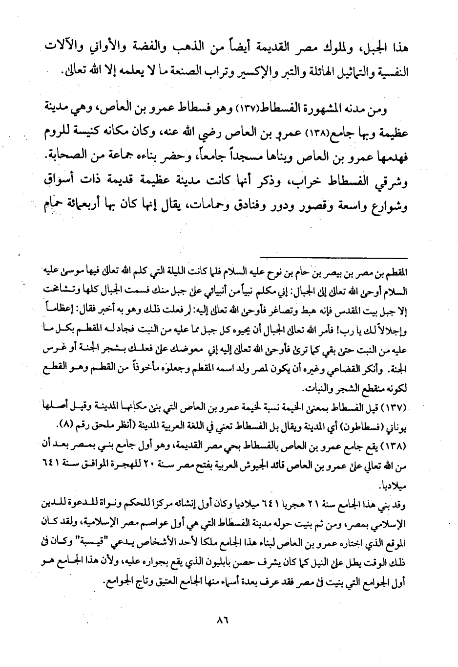 ومن مدنه المشهورة الفسطاط وهو فسطاط عمرو بن العاص، وهي مدينة عظيمة وبها جامع عمرو بن العاص رضي الله عنه، وكان مكانه كنيسة للروم فهدمها عمرو بن العاص وبناها مسجداً جامعاً، وحضر بناءه جماعة من الصحابة. وشرقي الفسطاط خراب، وذكر أنها كانت مدينة عظيمة قديمة ذات أسواق وشوارع واسعة وقصور ودور وفنادق وحمامات، يقال إنها كان بها أربعمائة حمام