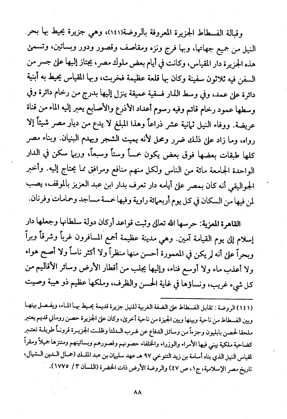 وقبالة الفسطاط الجزيرة المعروفة بالروضة، وهي جزيرة يحيط بها بحر النيل من جميع جهاتها، وبها فرج ونزه ومقاصف وقصور ودور وبساتين، وتسمى هذه الجزيرة دار المقياس، وكانت في أيام بعض ملوك مصر، يجتاز إليها على جسر من السفن فيه ثلاثون سفينة وكان بها قلعة عظيمة فخربت، وبها المقياس يحيط به أبنية دائرة على عمد، وفي وسط الدار فسقية عميقة ينزل إليها بدرج من رخام دائرة وفي وسطها عمود رخام قائم وفيه رسوم أعداد الأذرع والأصابع يعبر إليه الماء من قناة عريضة. ووفاء النيل ثمانية عشر ذراعاً وهذا المبلغ لا يدع من ديار مصر شيئاً إلا رواه، وما زاد على ذلك ضرر ومحل لأنه يميت الشجر ويهدم البنيان. وبناء مصر كلها طبقات بعضها فوق بعض يكون خمساً وستاً وسبعاً، وربما سكن في الدار الواحدة الجامعة مائة من الناس ولكل منهم منافع ومرافق مما يحتاج إليه. وأخبر الجواليقي أنه كان بمصر على أيامه دار تعرف بدار ابن عبد العزيز بالموقف، يصب لمن فيها من السكان في كل يوم أربعمائة راوية وفيها خمسة مساجد وحمامات وفرنان.