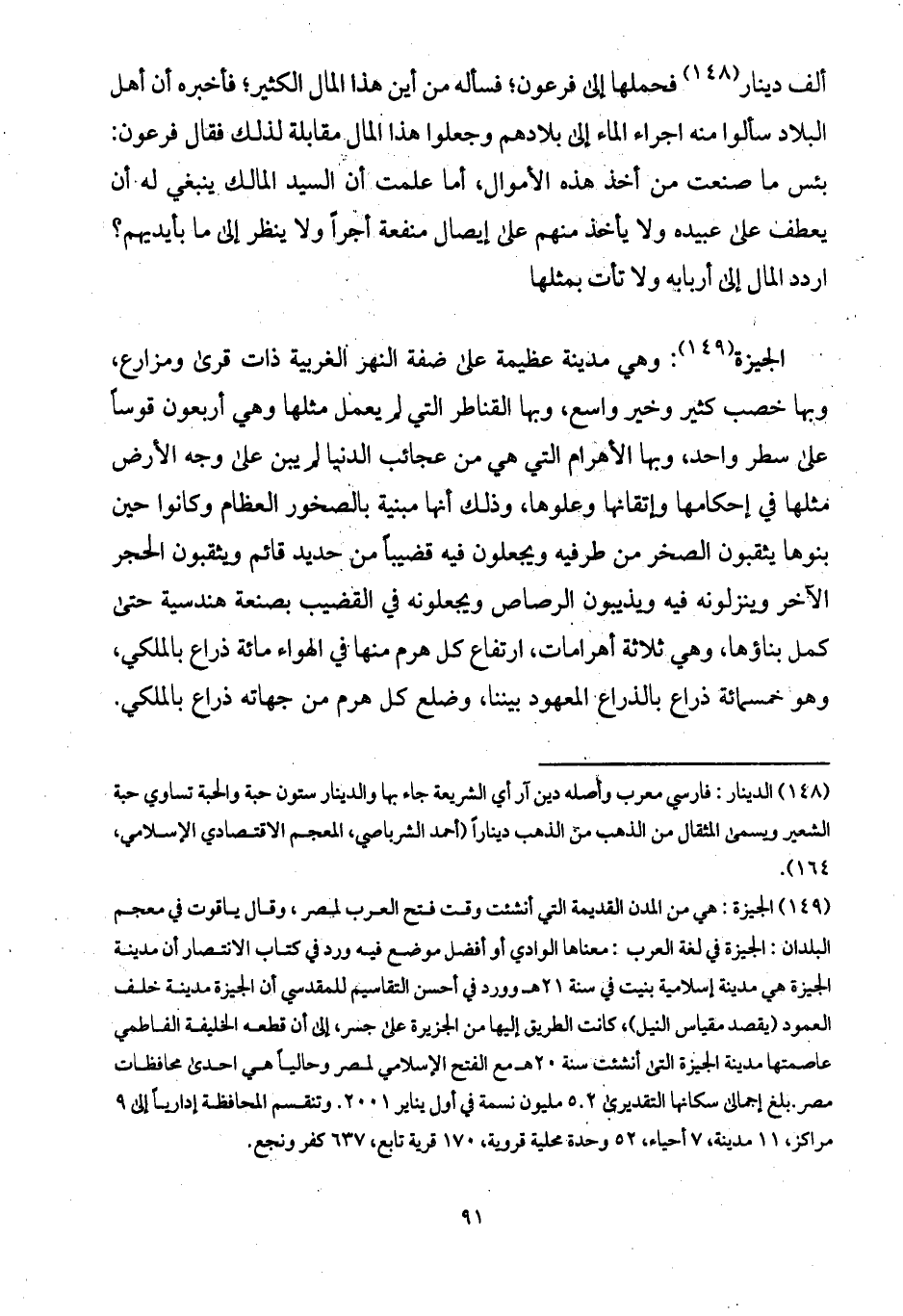 الجيزة: وهي مدينة عظيمة على ضفة النهر الغربية ذات قرى ومزارع، وبها خصب كثير وخير واسع، وبها القناطر التي لم يعمل مثلها وهي أربعون قوساً على سطر واحد، وبها الأهرام التي هي من عجائب الدنيا لم يبن على وجه الأرض مثلها في إحكامها وإتقانها وعلوها، وذلك أنها مبنية بالصخور العظام وكانوا حين بنوها يثقبون الصخر من طرفيه ويجعلون فيه قضيباً من حديد قائم ويثقبون الحجر الآخر وينزلونه فيه ويذيبون الرصاص ويجعلونه في القضيب بصنعة هندسية حتى كمل بناؤها، وهي ثلاثة أهرامات، ارتفاع كل هرم منها في الهواء مائة ذراع بالملكي، وهو خمسمائة ذراع بالذراع المعهود بيننا، وضلع كل هرم من جهاته ذراع بالملكي.