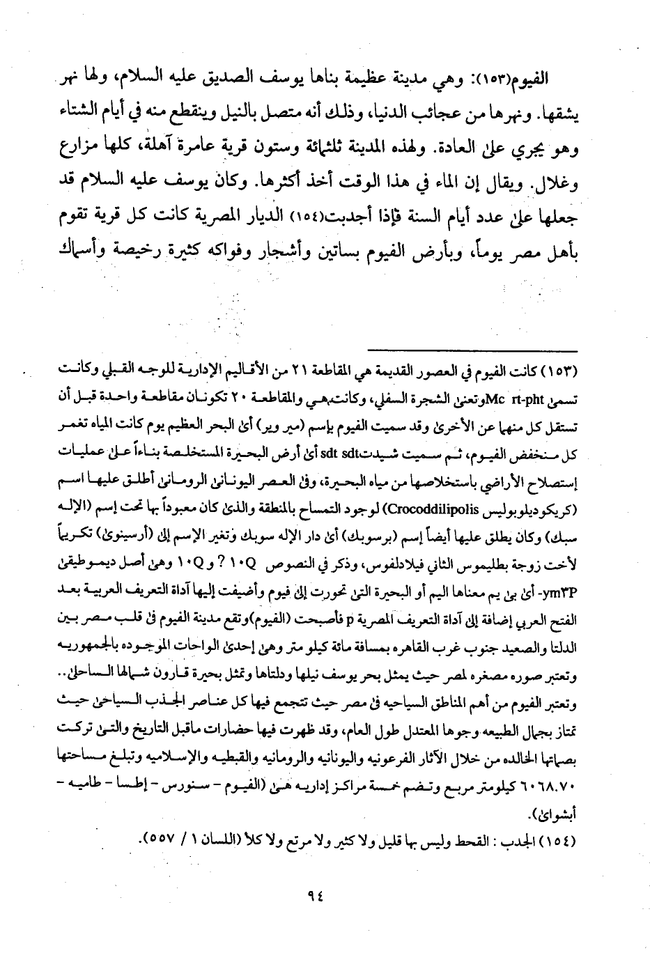 الفيوم: وهي مدينة عظيمة بناها يوسف الصديق عليه السلام، ولها نهر يشقها. ونهرها من عجائب الدنيا، وذلك أنه متصل بالنيل وينقطع منه في أيام الشتاء وهو يجري على العادة. ولهذه المدينة ثلثمائة وستون قرية عامرة آهلة، كلها مزارع وغلال. ويقال إن الماء في هذا الوقت أخذ أكثرها. وكان يوسف عليه السلام قد جعلها على عدد أيام السنة فإذا أجدبت الديار المصرية كانت كل قرية تقوم بأهل مصر يوماً، وبأرض الفيوم بساتين وأشجار وفواكه كثيرة رخيصة وأسماك