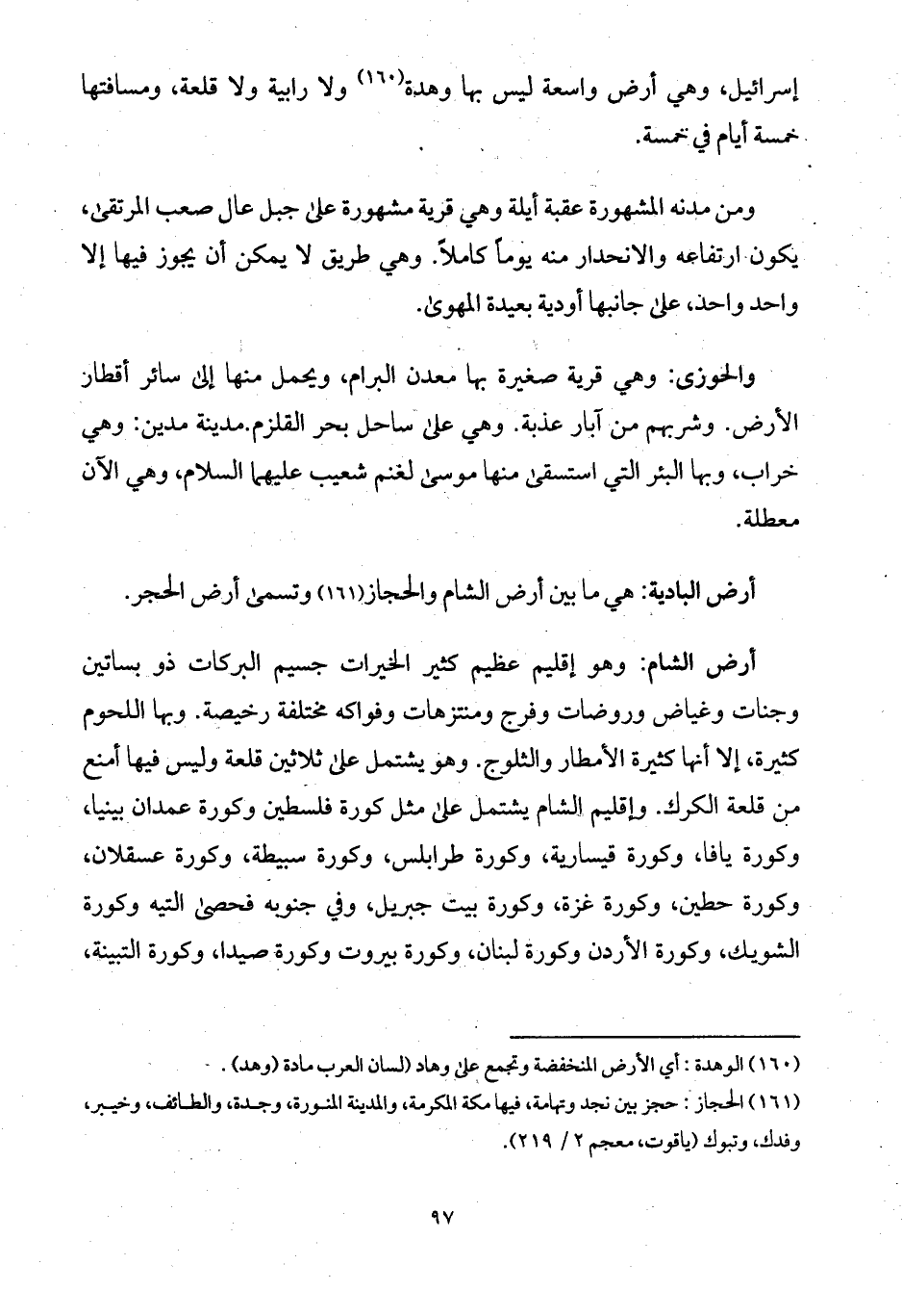 أرض الشام: وهو إقليم عظيم كثير الخيرات جسيم البركات ذو بساتين وجنات وغياض وروضات وفرج ومنتزهات وفواكه مختلفة رخيصة. وبها اللحوم كثيرة، إلا أنها كثيرة الأمطار والثلوج. وهو يشتمل على ثلاثين قلعة وليس فيها أمنع من قلعة الكرك. وإقليم الشام يشتمل على مثل كورة فلسطين وكورة عمدان بينيا، وكورة يافا، وكورة قيسارية، وكورة طرابلس، وكورة سبيطة، وكورة عسقلان، وكورة حطين، وكورة غزة، وكورة بيت جبريل، وفي جنوبه فحصى التيه وكورة الشويك، وكورة الأردن وكورة لبنان، وكورة بيروت وكورة صيدا، وكورة التبينة،