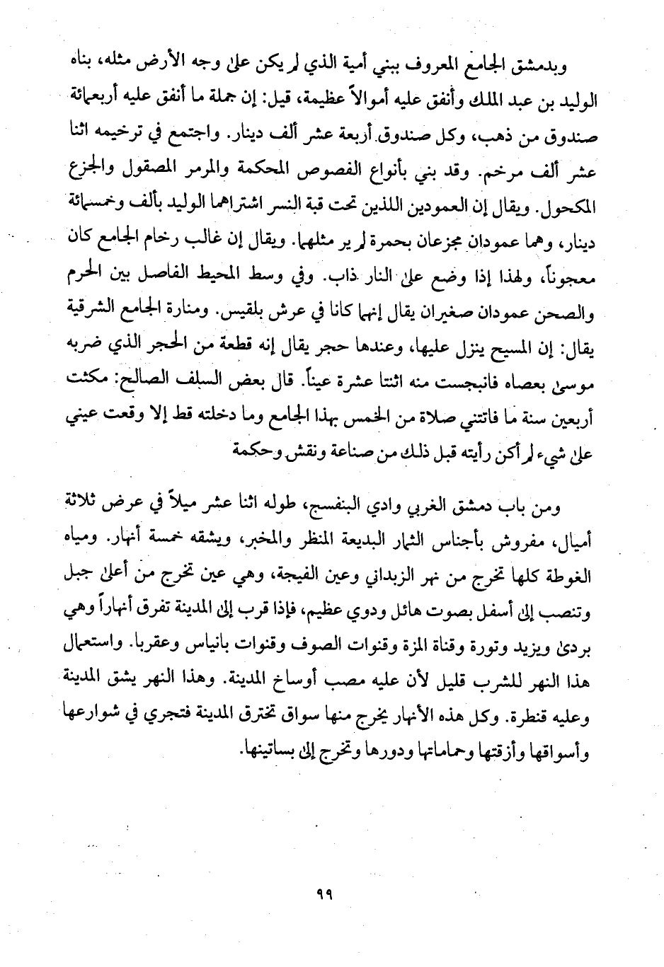وبدمشق الجامع المعروف ببني أمية الذي لم يكن على وجه الأرض مثله، بناه الوليد بن عبد الملك وأنفق عليه أموالاً عظيمة، قيل: إن جملة ما أنفق عليه أربعمائة صندوق من ذهب، وكل صندوق أربعة عشر ألف دينار. واجتمع في ترخيمه اثنا عشر ألف مرخم. وقد بني بأنواع الفصوص المحكمة والمرمر المصقول والجزع المكحول. ويقال إن العمودين اللذين تحت قبة النسر اشتراهما الوليد بألف وخمسمائة دينار، وهما عمودان مجزعان بحمرة لم ير مثلهما. ويقال إن غالب رخام الجامع كان معجوناً، ولهذا إذا وضع على النار ذاب. وفي وسط المحيط الفاصل بين الحرم والصحن عمودان صغيران يقال إنهما كانا في عرش بلقيس. ومنارة الجامع الشرقية يقال: إن المسيح ينزل عليها، وعندها حجر يقال إنه قطعة من الحجر الذي ضربه موسى بعصاه فانبجست منه اثنتا عشرة عيناً. قال بعض السلف الصالح: مكثت أربعين سنة ما فاتتني صلاة من الخمس بهذا الجامع وما دخلته قط إلا وقعت عيني على شيء لم أكن رأيته قبل ذلك من صناعة ونقش وحكمة.