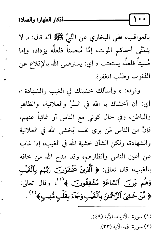 وقوله: "وأسألك خشيتك في الغيب والشهادة" أي: أن أخشاك يا الله في السِّرِّ والعلانية، والظاهر والباطن، وفي حال كوني مع الناس أو غائباً عنهم، فإنَّ من الناس مَن يرى نفسه يَخشى الله في العلانية والشهادة، ولكن الشأن خشية الله في الغيب، إذا غاب عن أعين الناس وأنظارهم، وقد مدح الله من خافه بالغيب، قال تعالى: {الَّذِينَ يَخْشَوْنَ رَبَّهُمْ بِالْغَيْبِ وَهُمْ مِنَ السَّاعَةِ مُشْفِقُونَ} 1، وقال تعالى: {مَنْ خَشِيَ الرَّحْمَنَ بِالْغَيْبِ وَجَاءَ بِقَلْبٍ مُنِيبٍ} 2.
