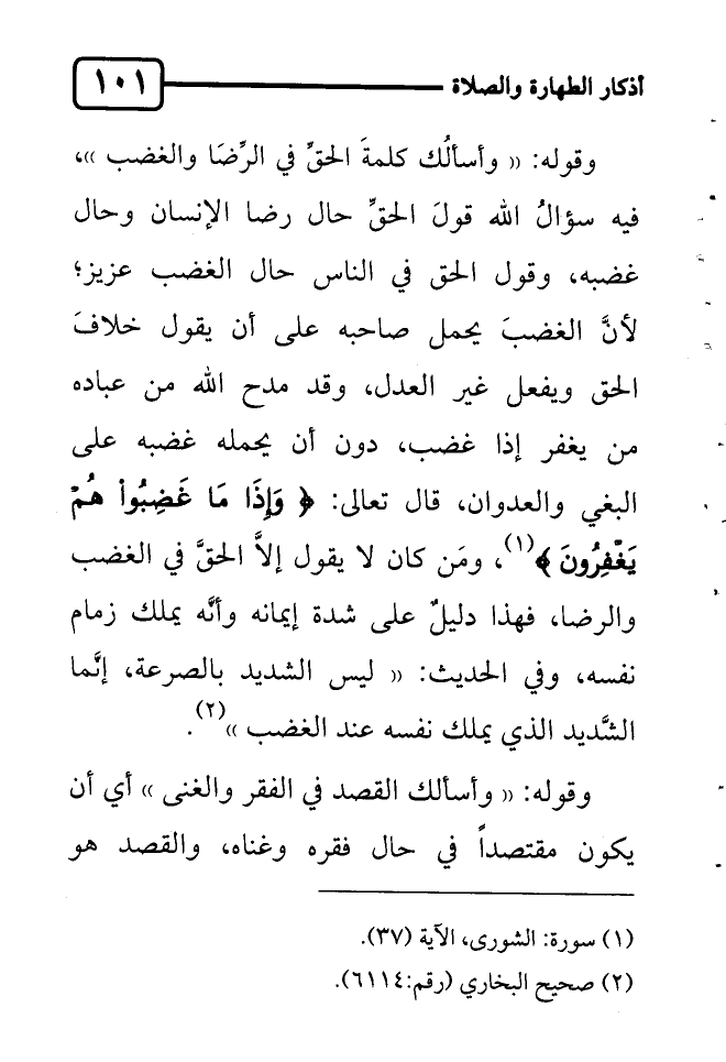 وقوله: "وأسألُك كلمةَ الحقِّ في الرِّضَا والغضب"، فيه سؤالُ الله قولَ الحقِّ حال رضا الإنسان وحال غضبه، وقول الحق في الناس حال الغضب عزيز؛ لأنَّ الغضبَ يحمل صاحبه على أن يقول خلافَ الحق ويفعل غير العدل، وقد مدح الله من عباده من يغفر إذا غضب، دون أن يحمله غضبه على البغي والعدوان، قال تعالى: {وَإِذَا مَا غَضِبُوا هُمْ يَغْفِرُونَ} 1، ومَن كان لا يقول إلاَّ الحقَّ في الغضب والرضا، فهذا دليلٌ على شدة إيمانه وأنَّه يملك زمام نفسه، وفي الحديث: "ليس الشديد بالصرعة، إنَّما الشَّديد الذي يملك نفسه عند الغضب" 2.