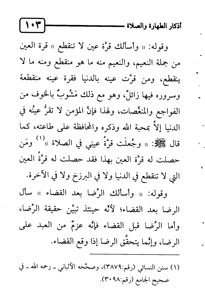 وقوله: "وأسألك قرَّة عين لا تنقطع" قرة العين من جملة النعيم، والنعيم منه ما هو منقطع ومنه ما لا ينقطع، ومن قرَّت عينه بالدنيا فقرة عينه منقطعة وسروره فيها زائلٌ، وهو مع ذلك مَشُوبٌ بالخوف من الفواجع والمنغِّصات، ولهذا فإنَّ المؤمن لا تقرُّ عينُه في الدنيا إلاَّ بمحبة الله وذكره والمحافظة على طاعته، كما قال صلى الله عليه وسلم: "وجُعلَت قرَّةُ عينِي في الصلاة" 1 ومَن حصلت له قرَّة العين بهذا فقد حصلت له قرَّةُ العين التي لا تنقطع في الدنيا ولا في البرزخ ولا في الآخرة.