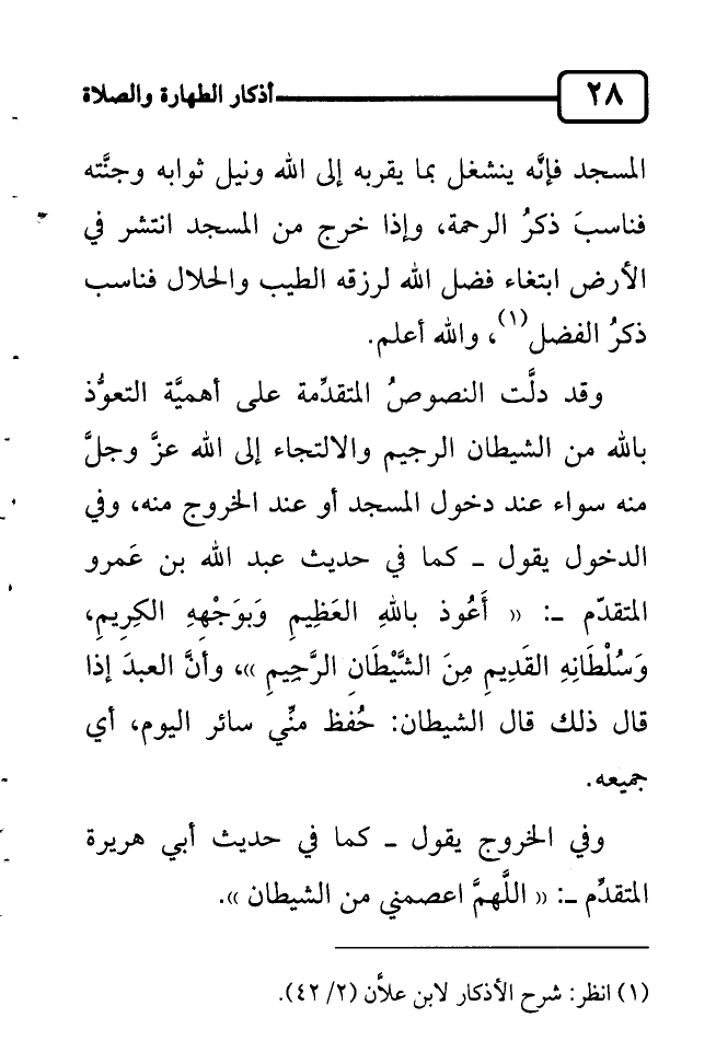 وقد دلَّت النصوصُ المتقدِّمة على أهميَّة التعوُّذ بالله من الشيطان الرجيم والالتجاء إلى الله عزَّ وجلَّ منه سواء عند دخول المسجد أو عند الخروج منه، وفي الدخول يقول ـ كما في حديث عبد الله بن عَمرو المتقدّم ـ: "أَعُوذ باللهِ العَظِيمِ وَبوَجْهِهِ الكِرِيمِ، وَسُلْطَانِهِ القَدِيمِ مِنَ الشَّيْطَانِ الرَّجِيمِ"، وأنَّ العبدَ إذا قال ذلك قال الشيطان: حُفظ منِّي سائر اليوم، أي جميعه.