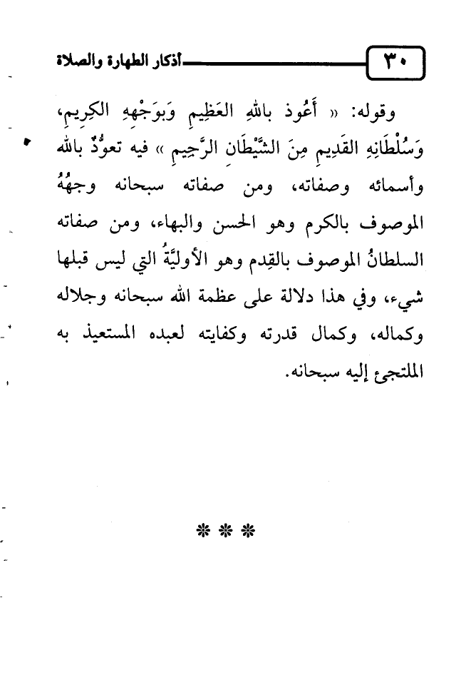 وقوله: "أَعُوذ باللهِ العَظِيمِ وَبوَجْهِهِ الكِرِيمِ، وَسُلْطَانِهِ القَدِيمِ مِنَ الشَّيْطَانِ الرَّجِيمِ" فيه تعوُّذٌ بالله وأسمائه وصفاته، ومن صفاته سبحانه وجهُهُ الموصوف بالكرم وهو الحسن والبهاء، ومن صفاته السلطانُ الموصوف بالقِدم وهو الأوليَّةُ التي ليس قبلها شيء، وفي هذا دلالة على عظمة الله سبحانه وجلاله وكماله، وكمال قدرته وكفايته لعبده المستعيذ به الملتجئ إليه سبحانه.