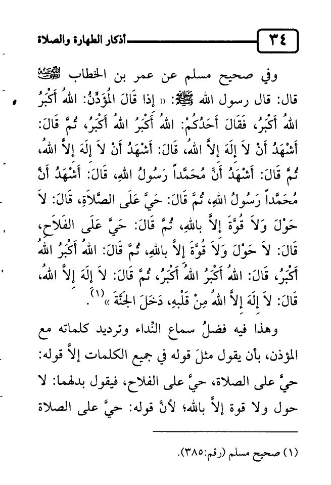 وفي صحيح مسلم عن عمر بن الخطاب رضي الله عنه قال: قال رسول الله صلى الله عليه وسلم: "إِذا قَالَ المُؤَذِّنُ: اللهُ أَكْبَرُ اللهُ أَكْبَرُ، فَقَالَ أَحَدُكُمْ: اللهُ أَكْبَرُ اللهُ أَكْبَرُ، ثُمَّ قَالَ: أَشْهَدُ أَنْ لاَ إِلَهَ إِلاَّ اللهُ، قَالَ: أَشْهَدُ أَنْ لاَ إِلَهَ إِلاَّ اللهُ، ثُمَّ قَالَ: أَشْهَدُ أَنَّ مُحَمَّداً رَسُولُ اللهِ، قَالَ: أَشْهَدُ أَنَّ مُحَمَّداً رَسُولُ اللهِ، ثُمَّ قَالَ: حَيَّ عَلَى الصَّلاَةِ، قَالَ: لاَ حَوْلَ وَلاَ قُوَّةَ إِلاَّ باللهِ، ثُمَّ قَالَ: حَيَّ عَلَى الفَلاَحِ، قَالَ: لاَ حَوْلَ وَلاَ قُوَّةَ إِلاَّ باللهِ، ثُمَّ قَالَ: اللهُ أَكْبَرُ اللهُ أَكْبَرُ، قَالَ: اللهُ أَكْبَرُ اللهُ أَكْبَرُ، ثُمَّ قَالَ: لاَ إِلَهَ إِلاَّ اللهُ، قَالَ: لاَ إِلَهَ إِلاَّ اللهُ مِنْ قَلْبهِ، دَخَلَ الجَنَّةَ" 1.