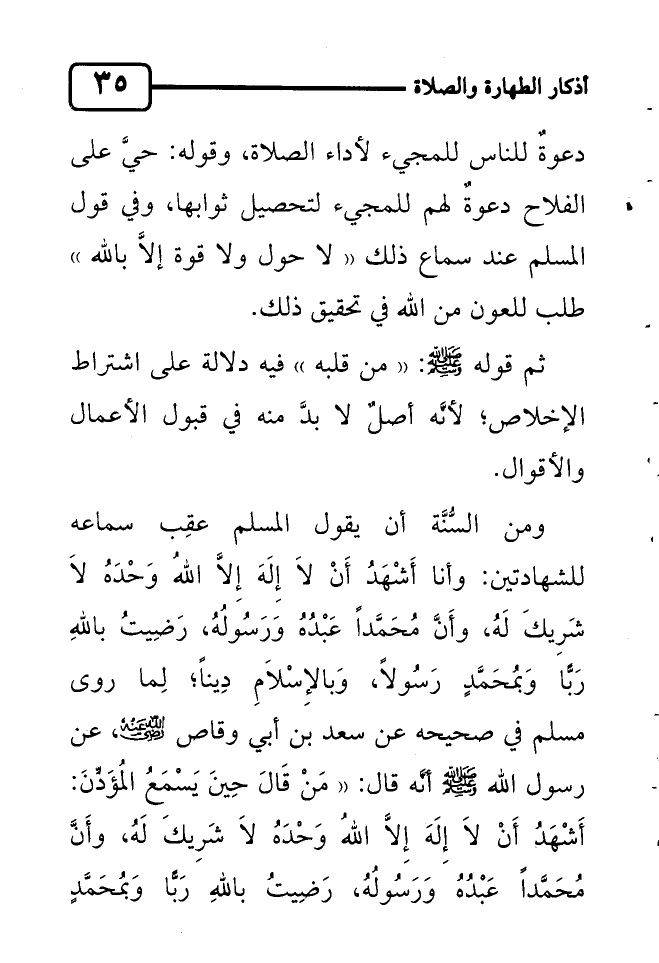 ومن السُّنَّة أن يقول المسلم عقِب سماعه للشهادتين: وأنا أَشْهَدُ أَنْ لاَ إِلَهَ إِلاَّ اللهُ وَحْدَهُ لاَ شَرِيكَ لَهُ، وأَنَّ مُحَمَّداً عَبْدُهُ وَرَسُولُهُ، رَضِيتُ باللهِ رَبًّا وَبمُحَمَّدٍ رَسُولاً، وَبالإِسْلاَمِ دِيناً؛ لِما روى مسلم في صحيحه عن سعد بن أبي وقاص رضي الله عنه، عن رسول الله صلى الله عليه وسلم أنَّه قال: "مَنْ قَالَ حِينَ يَسْمَعُ المُؤَذِّنَ: أَشْهَدُ أَنْ لاَ إِلَهَ إِلاَّ اللهُ وَحْدَهُ لاَ شَرِيكَ لَهُ، وأَنَّ مُحَمَّداً عَبْدُهُ وَرَسُولُهُ، رَضِيتُ باللهِ رَبًّا وَبمُحَمَّدٍ