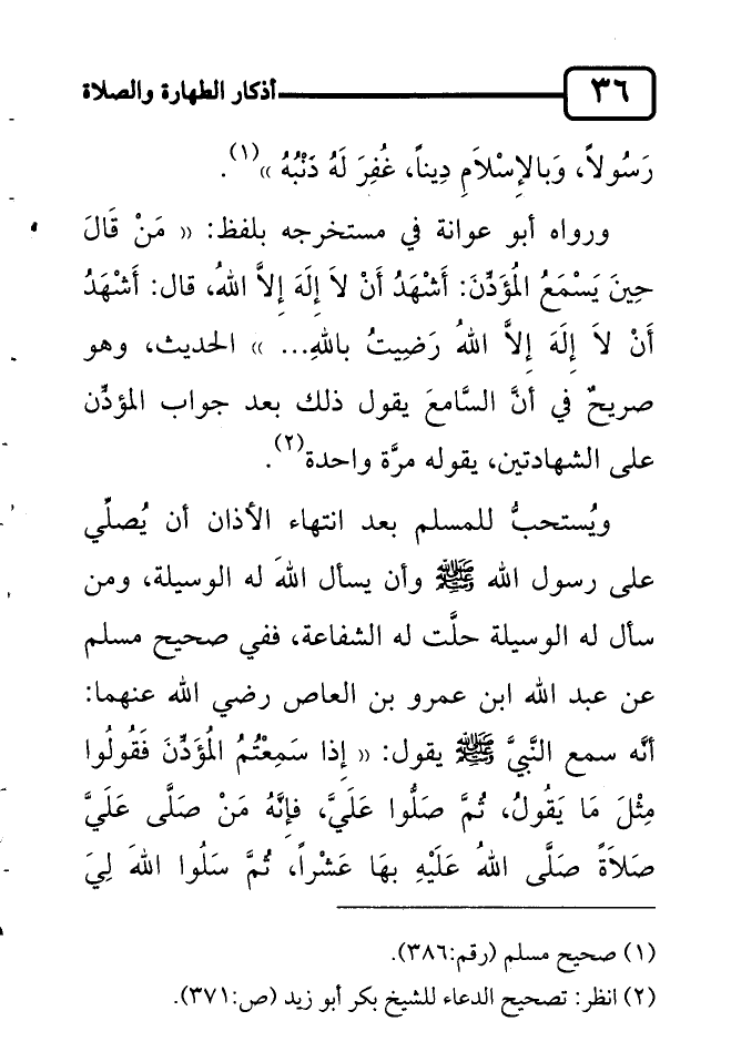ورواه أبو عوانة في مستخرجه بلفظ: "مَنْ قَالَ حِينَ يَسْمَعُ المُؤَذِّنَ: أَشْهَدُ أَنْ لاَ إِلَهَ إِلاَّ اللهُ، قال: أَشْهَدُ أَنْ لاَ إِلَهَ إِلاَّ اللهُ رَضِيتُ باللهِ ... " الحديث، وهو صريحٌ في أنَّ السَّامعَ يقول ذلك بعد جواب المؤذِّن على الشهادتين، يقوله مرَّة واحدة2.