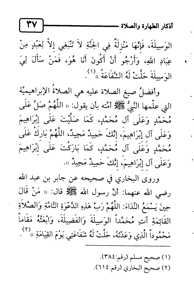 وروى البخاري في صحيحه عن جابر بن عبد الله رضي الله عنهما: أنَّ رسول الله صلى الله عليه وسلم قال: "مَنْ قَالَ حِينَ يَسْمَعُ النِّدَاءَ: اللَّهُمَّ رَبَّ هَذِهِ الدَّعْوَةِ التَّامَّةِ وَالصَّلاَةِ القَائِمَةِ آتِ مُحَمَّداً الوَسِيلَةَ وَالفَضِيلَةَ، وَابْعَثْهُ مَقَاماً مَحْمُوداً الَّذِي وَعَدْتَهُ، حَلَّتْ لَهُ شَفَاعَتِي يَوْمَ القِيَامَةِ" 2.