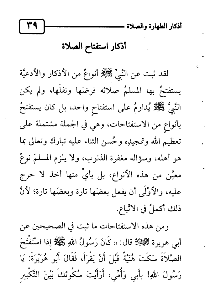 ومن هذه الاستفتاحات ما ثبت في الصحيحين عن أبي هريرة رضي الله عنه قال: "كَانَ رَسُولُ اللهِ صلى الله عليه وسلم إِذا اسْتَفْتَحَ الصَّلاَةَ سَكَتَ هُنَيَّةً قَبْلَ أَنْ يَقْرَأَ، فَقَالَ أَبُو هُرَيْرَةَ: يَا رَسُولَ اللهِ! بأَبي وَأُمِّي، أَرَأَيْتَ سُكُوتَكَ بَيْنَ التَّكْبيرِ