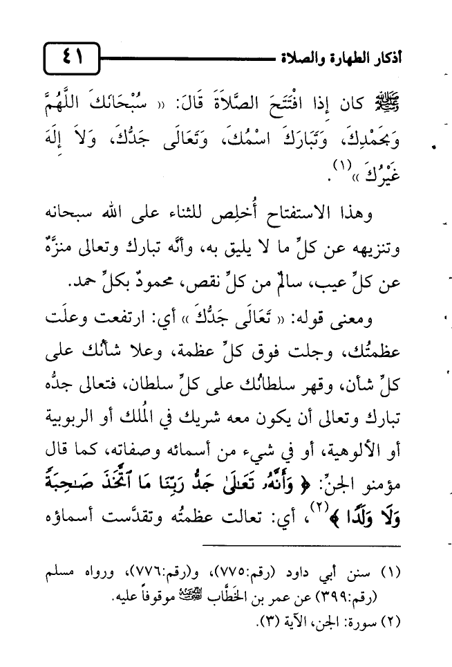 صلى الله عليه وسلم كان إِذا افْتَتَحَ الصَّلاَةَ قَالَ: "سُبْحَانَكَ اللَّهُمَّ وَبحَمْدِكَ، وَتَبَارَكَ اسْمُكَ، وَتَعَالَى جَدُّكَ، وَلاَ إِلَهَ غَيْرُكَ" 1.