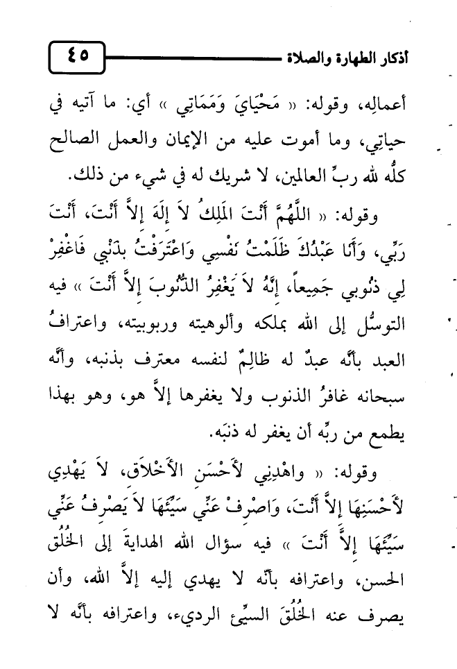 وقوله: "واهْدِنِي لأَحْسَنِ الأَخْلاَقِ، لاَ يَهْدِي لأَحْسَنِهَا إِلاَّ أَنْتَ، وَاصْرِفْ عَنِّي سَيِّئَهَا لاَ يَصْرِفُ عَنِّي سَيِّئَهَا إِلاَّ أَنْتَ" فيه سؤال الله الهدايةَ إلى الخُلُق الحسن، واعترافه بأنّه لا يهدي إليه إلاَّ الله، وأن يصرف عنه الخُلُقَ السيِّئ الرديء، واعترافه بأنَّه لا