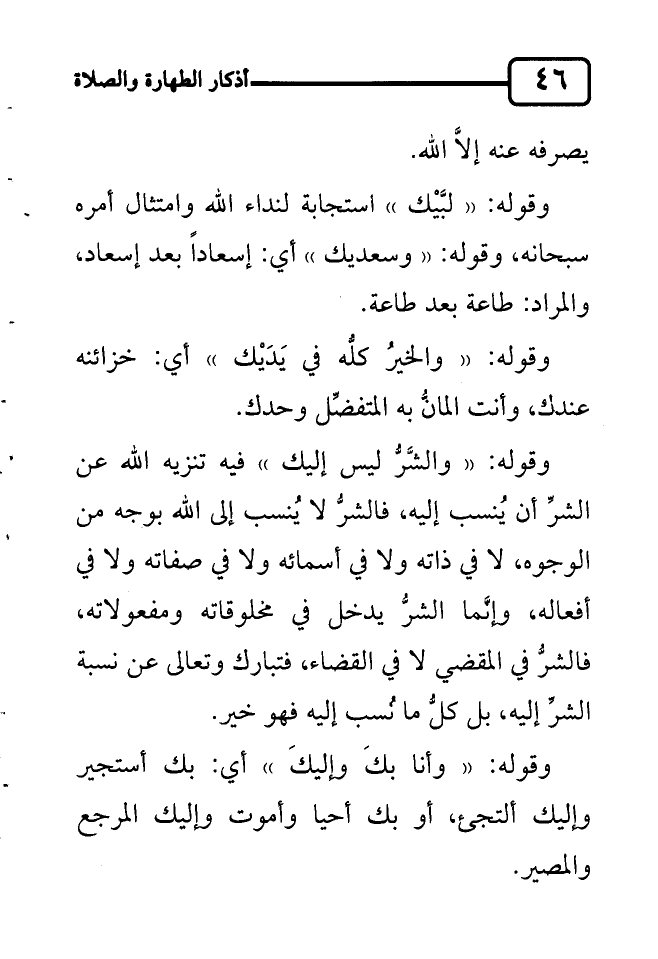 وقوله: "والشَّرُّ ليس إليك" فيه تنزيه الله عن الشرِّ أن يُنسب إليه، فالشرُّ لا يُنسب إلى الله بوجه من الوجوه، لا في ذاته ولا في أسمائه ولا في صفاته ولا في أفعاله، وإنَّما الشرُّ يدخل في مخلوقاته ومفعولاته، فالشرُّ في المقضي لا في القضاء، فتبارك وتعالى عن نسبة الشرِّ إليه، بل كلُّ ما نُسب إليه فهو خير.