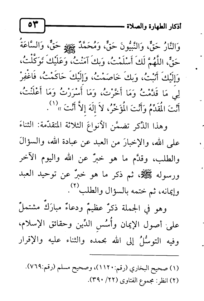 وَالنَّارُ حَقٌّ، وَالنَّبيُّونَ حَقٌّ، وَمُحَمَّدٌ صلى الله عليه وسلم حَقٌّ، وَالسَّاعَةُ حَقٌّ، اللَّهُمَّ لَكَ أَسْلَمْتُ، وَبكَ آمَنْتُ، وَعَلَيْكَ تَوَكَّلْتُ، وَإِلَيْكَ أَنَبْتُ، وَبكَ خَاصَمْتُ، وَإِلَيْكَ حَاكَمْتُ، فَاغْفِرْ لِي مَا قَدَّمْتُ وَمَا أَخَّرْتُ، وَمَا أَسْرَرْتُ وَمَا أَعْلَنْتُ، أَنْتَ المُقَدِّمُ وَأَنْتَ المُؤَخِّرُ، لاَ إِلَهَ إِلاَّ أَنْتَ" 1.