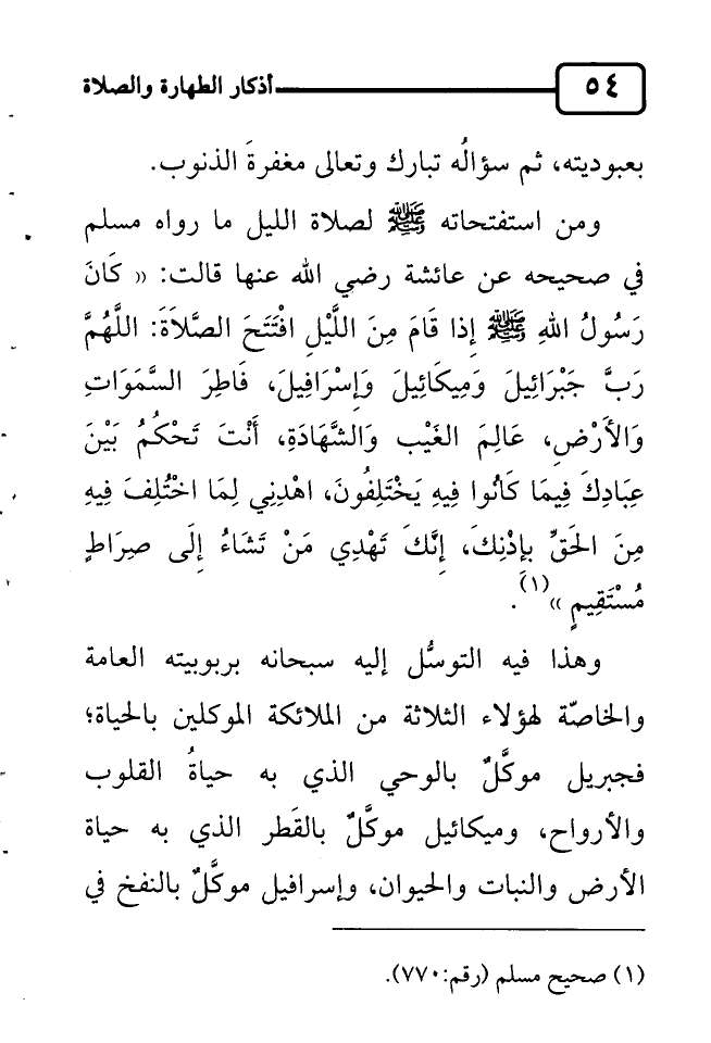 وهذا فيه التوسُّل إليه سبحانه بربوبيته العامة والخاصّة لهؤلاء الثلاثة من الملائكة الموكلين بالحياة؛ فجبريل موكَّلٌ بالوحي الذي به حياةُ القلوب والأرواح، وميكائيل موكَّلٌ بالقَطر الذي به حياة الأرض والنبات والحيوان، وإسرافيل موكَّلٌ بالنفخ في