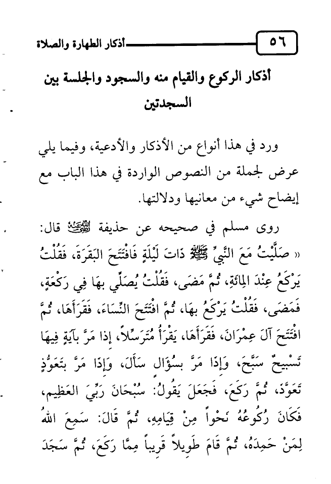 روى مسلم في صحيحه عن حذيفة رضي الله عنه قال: "صَلَّيْتُ مَعَ النَّبيِّ صلى الله عليه وسلم ذَاتَ لَيْلَةٍ فَافْتَتَحَ البَقَرَةَ، فَقُلْتُ يَرْكَعُ عِنْدَ المِائَةِ، ثُمَّ مَضَى، فَقُلْتُ يُصَلِّي بهَا فِي رَكْعَةٍ، فَمَضَى، فَقُلْتُ يَرْكَعُ بهَا، ثُمَّ افْتَتَحَ النِّسَاءَ، فَقَرَأَهَا، ثُمَّ افْتَتَحَ آلَ عِمْرَانَ، فَقَرَأَهَا، يَقْرَأُ مُتَرَسِّلاً، إِذا مَرَّ بآيَةٍ فِيهَا تَسْبيحٌ سَبَّحَ، وَإِذَا مَرَّ بسُؤَالٍ سَأَلَ، وَإِذَا مَرَّ بتَعَوُّذٍ تَعَوَّذَ، ثُمَّ رَكَعَ، فَجَعَلَ يَقُولُ: سُبْحَانَ رَبِّيَ العَظِيم، فَكَانَ رُكُوعُهُ نَحْواً مِنْ قِيَامِهِ، ثُمَّ قَالَ: سَمِعَ اللهُ لِمَنْ حَمِدَهُ، ثُمَّ قَامَ طَوِيلاً قَرِيباً مِمَّا رَكَعَ، ثُمَّ سَجَدَ