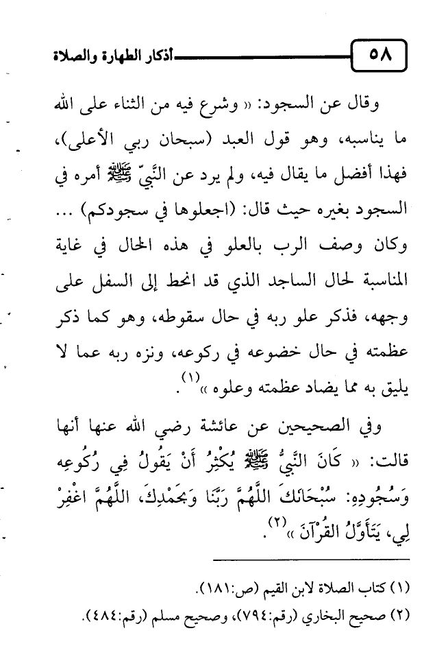 وقال عن السجود: "وشرع فيه من الثناء على الله ما يناسبه، وهو قول العبد (سبحان ربي الأعلى) ، فهذا أفضل ما يقال فيه، ولم يرد عن النَّبيّ صلى الله عليه وسلم أمره في السجود بغيره حيث قال: (اجعلوها في سجودكم) ... وكان وصف الرب بالعلو في هذه الحال في غاية المناسبة لحال الساجد الذي قد انحط إلى السفل على وجهه، فذكر علو ربه في حال سقوطه، وهو كما ذكر عظمته في حال خضوعه في ركوعه، ونزه ربه عما لا يليق به مما يضاد عظمته وعلوه"1.