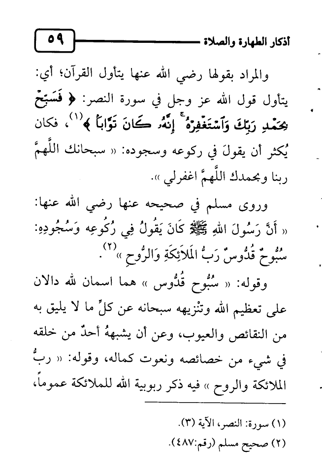وروى مسلم في صحيحه عنها رضي الله عنها: "أَنَّ رَسُولَ اللهِ صلى الله عليه وسلم كَانَ يَقُولُ فِي رُكُوعِه وَسُجُودِهِ: سُبُّوحٌ قُدُّوسٌ رَبُّ المَلاَئِكَةِ وَالرُّوحِ" 2.