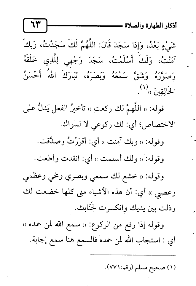 قوله: "اللَّهمَّ لك ركعت" تأخيرُ الفعل يَدلُّ على الاختصاص؛ أي: لك ركوعي لا لسواك.