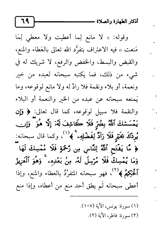 وقوله: "لا مانع لِما أعطيت ولا معطي لِمَا مَنعت" فيه الاعتراف بتفرُّد الله تعالى بالعَطاء والمنع، والقبض والبسط، والخفض والرفع، لا شريك له في شيء من ذلك، فما يكتبه سبحانه لعبده من خير ونعمة، أو بلاء ونقمة فلا رادَّ له ولا مانع لوقوعه، وما يَمنعه سبحانه عن عبده من الخير والنعمة أو البلاء والنقمة فلا سبيل لوقوعه، كما قال تعالى: {وَإِنْ يَمْسَسْكَ اللَّهُ بِضُرٍّ فَلا كَاشِفَ لَهُ إِلاَّ هُوَ وَإِنْ يُرِدْكَ بِخَيْرٍ فَلا رَادَّ لِفَضْلِهِ} 1، وكما قال سبحانه: {مَا يَفْتَحِ اللَّهُ لِلنَّاسِ مِنْ رَحْمَةٍ فَلا مُمْسِكَ لَهَا وَمَا يُمْسِكْ فَلا مُرْسِلَ لَهُ مِنْ بَعْدِهِ وَهُوَ الْعَزِيزُ الْحَكِيمُ} 2، فهو سبحانه المتفرِّدُ بالعطاء والمنع، وإذا أعطى سبحانه لَم يطق أحد منع من أعطاه، وإذا منع
