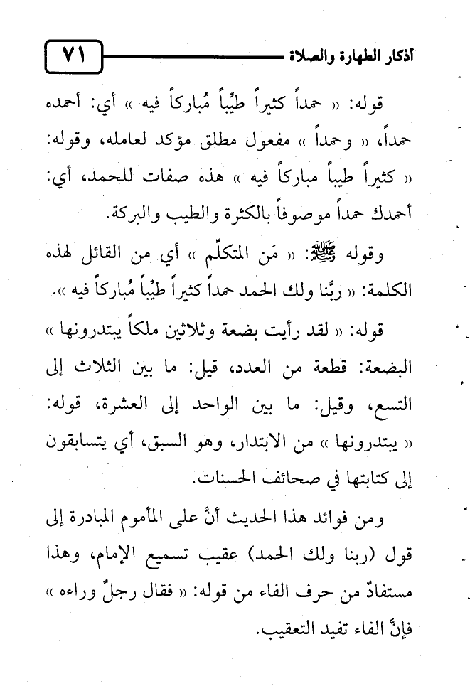 وقوله صلى الله عليه وسلم: "مَن المتكلِّم" أي من القائل لهذه الكلمة: "ربَّنا ولك الحمد حمداً كثيراً طيِّباً مُباركاً فيه".
