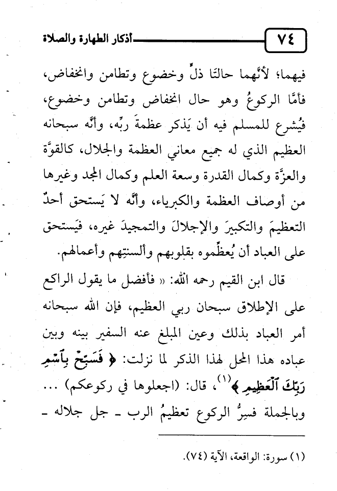 قال ابن القيم رحمه الله: "فأفضل ما يقول الراكع على الإطلاق سبحان ربي العظيم، فإن الله سبحانه أمر العباد بذلك وعين المبلغ عنه السفير بينه وبين عباده هذا المحل لهذا الذكر لما نزلت: {فَسَبِّحْ بِاسْمِ رَبِّكَ الْعَظِيمِ} 1، قال: (اجعلوها في ركوعكم) … وبالجملة فسِرُّ الركوع تعظيمُ الرب ـ جل جلاله ـ