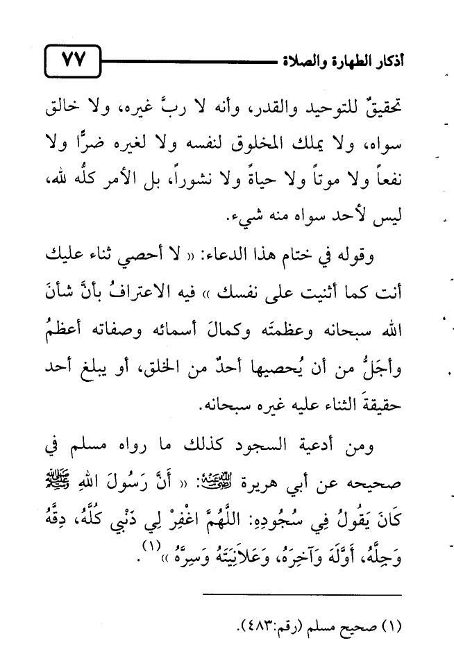 ومن أدعية السجود كذلك ما رواه مسلم في صحيحه عن أبي هريرة رضي الله عنه: "أَنَّ رَسُولَ اللهِ صلى الله عليه وسلم كَانَ يَقُولُ فِي سُجُودِهِ: اللَّهُمَّ اغْفِرْ لِي ذَنْبي كُلَّهُ، دِقَّهُ وَجِلَّهُ، أَوَّلَهَ وَآخِرَهُ، وَعَلاَنِيَتَهُ وَسِرَّهُ" 1.