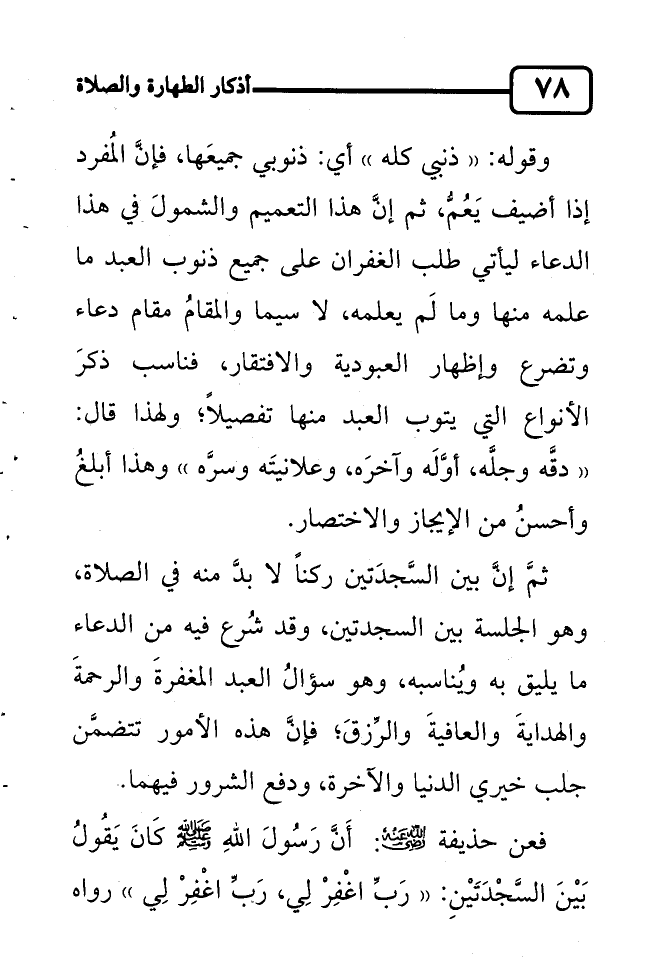 ثمَّ إنَّ بين السَّجدَتين ركناً لا بدَّ منه في الصلاة، وهو الجلسة بين السجدتين، وقد شُرع فيه من الدعاء ما يليق به ويُناسبه، وهو سؤالُ العبد المغفرةَ والرحمةَ والهدايةَ والعافيةَ والرِّزقَ؛ فإنَّ هذه الأمور تتضمَّن جلب خيري الدنيا والآخرة، ودفع الشرور فيهما.